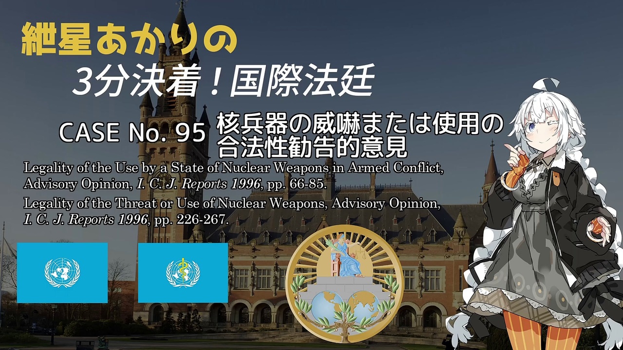 (2023年)(令和5年度)(ICJの勧告的意見)のトリプル初投稿です。<br><br>【訂正】<br>①中立法の解説部分で、ウクライナ支援と中立法について、侵略犯罪がICC規程上のコアクライムであるという解説があります。この部分は、編集段階で削除から漏れてしまったものであり、<strong>文脈上極めてミスリーディング</strong>であるため、ここで追記します。<br>ICCが侵略犯罪に対して管轄権を有しうるのは確かですが、他のコアクライム(ジェノサイド罪、戦争犯罪、人道に対する犯罪)と違い、管轄権を行使しうる要件が異なるため、<strong><u>ロシアによるウクライナ侵略において、ICCはロシアの侵略犯罪につき管轄権を行使できません</u></strong>。<br>ICC規程15条の2(5)は、非締約国の国民により、または領域内で犯された侵略犯罪に対して、ICCの管轄権を認めていないためです。<br><br>②参考文献で見切れているものがあったため、こちらに記載します。<br>国際司法裁判所判例研究会「判例研究・国際司法裁判所 武力紛争における国家による核兵器使用の合法性(WHOの要請)(勧告的意見・一九九六年七月八日)」『国際法外交雑誌』99巻2号(2000年)33-43頁(杉原高嶺)。<br><br>国際司法裁判所判例研究会「判例研究・国際司法裁判所 核兵器の威嚇又は使用の合法性(勧告的意見・一九九六年七月八日)」『国際法外交雑誌』99巻3号(2000年)62-87頁(真山全)。<br><br>廣瀬和子「核兵器の使用規制――原爆判決からICJの勧告的意見までの言説分析を通してみられる現代国際法の複合性――」村瀬信也・真山全編『武力紛争の国際法』(東信堂、2004年)424-459頁。<br><br><br>やや重い3分間になるかもしれませんが、最後までご覧いただけると嬉しいです。<br>次の動画はもう少し短い間隔で投稿できるように頑張ります。<br><br>WHO諮問のページはこちら<br><a href="https://www.icj-cij.org/case/93" target="_blank" rel="noopener nofollow">https://www.icj-cij.org/case/93</a><br>国連総会諮問のページはこちら<br><a href="https://www.icj-cij.org/case/95" target="_blank" rel="noopener nofollow">https://www.icj-cij.org/case/95</a><br><br>「3分決着!国際法廷」シリーズはこちら(<a href="https://www.nicovideo.jp/mylist/73486825" target="_blank" rel="noopener">mylist/73486825</a>)<br><br>元ネタの「3分即決!国際法廷」シリーズはこちら(<a href="https://www.nicovideo.jp/mylist/66005874" target="_blank" rel="noopener">mylist/66005874</a>)<br><br>同シリーズの作者、せるばんださんはこちら(<a href="https://www.nicovideo.jp/user/89884381" target="_blank" rel="noopener">user/89884381</a>)<br><br>動画中でお借りしたせるばんださんの<br>3分即決国際法廷番外編「世界一有名なあの十字」【第六回ひじき祭】【VOICEROID解説】<br>はこちら(<a href="https://www.nicovideo.jp/watch/sm37444211" class="watch">sm37444211</a>)<br><br>