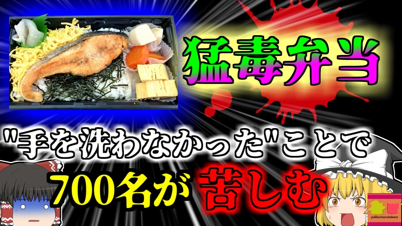 <a href="#" class="seekTime" data-seekTime="00:00" onclick="seekNicoPlayer('#00:00'); return false;">#00:00</a> 冒頭挨拶<br><a href="#" class="seekTime" data-seekTime="00:34" onclick="seekNicoPlayer('#00:34'); return false;">#00:34</a> 視聴上の注意<br><a href="#" class="seekTime" data-seekTime="1:13" onclick="seekNicoPlayer('#1:13'); return false;">#1:13</a> 本編開始<br><a href="#" class="seekTime" data-seekTime="1:37" onclick="seekNicoPlayer('#1:37'); return false;">#1:37</a> 仕出し弁当<br><a href="#" class="seekTime" data-seekTime="1:53" onclick="seekNicoPlayer('#1:53'); return false;">#1:53</a> 翌日の異変<br><a href="#" class="seekTime" data-seekTime="2:44" onclick="seekNicoPlayer('#2:44'); return false;">#2:44</a> 他の従業員も同じ症状が<br><a href="#" class="seekTime" data-seekTime="3:18" onclick="seekNicoPlayer('#3:18'); return false;">#3:18</a> 病院での検査・処置<br><a href="#" class="seekTime" data-seekTime="3:46" onclick="seekNicoPlayer('#3:46'); return false;">#3:46</a> 「ノロウイルス」<br><a href="#" class="seekTime" data-seekTime="5:52" onclick="seekNicoPlayer('#5:52'); return false;">#5:52</a> 製造業者への立ち入り検査<br><a href="#" class="seekTime" data-seekTime="6:44" onclick="seekNicoPlayer('#6:44'); return false;">#6:44</a> 原因は"手洗いをしなかったこと"<br><a href="#" class="seekTime" data-seekTime="8:13" onclick="seekNicoPlayer('#8:13'); return false;">#8:13</a> その後の処分・指導<br><a href="#" class="seekTime" data-seekTime="9:15" onclick="seekNicoPlayer('#9:15'); return false;">#9:15</a> 予防方法<br><br><br><br>#食中毒 #ノロウイルス #食品衛生<br>今回紹介するのは、以前リクエストがありました、ノロウイルス感染症についてです。<br>関東地方某都市で、会社員として働く女性「Aさん」はこの日、いつも通りに業務にあたっていましたが、終業時間手前の夕方、突然猛烈な吐き気に襲われ、トイレで戻してしまいました。<br>特に体調不良などもなく、傷んだ食べ物を口にした覚えもなかったAさんは、突然のこの症状に困惑していましたが、次第に激しい腹痛や下痢の症状までもが現れ、トイレの中でしばらく苦しんでいました。<br>ようやく症状が落ち着き、デスクに戻ったAさんでしたが、席に着くと上司から声をかけられ、複数の社員が、下痢や嘔吐などの症状を訴えていると話されました。<br>上司はこのことから、集団食中毒が起きていると考え、病院に連絡し、部下たちに近くの病院で診察を受けるようにと指示を出しました。<br>担当した医師は、集団食中毒が発生したと判断し、保健所に通報を行い、調査が行われました。<br><br>その結果、Aさんたちは、前日に会社で支給されていた、仕出し弁当を喫食したことによって、ノロウイルス感染症に罹っており、あの症状を発症していたことが分かりました。<br><br>そして、保健所がこの弁当製造業者を調査すると、<br>食品衛生に関する、杜撰な管理体制が浮き彫りとなり・・・<br><br><br>引用・出展・参考文献<br>厚生労働省 ノロウイルスに関するQ&A<br><a href="https://ishort.ink/ucbS" target="_blank" rel="noopener nofollow">https://ishort.ink/ucbS</a><br>Wikipedia ノロウイルス<br><a href="https://ishort.ink/DETv" target="_blank" rel="noopener nofollow">https://ishort.ink/DETv</a><br>東京都福祉保健局 東京都多摩小平保健所「ノロウイルスとは?」<br><a href="https://ishort.ink/efTp" target="_blank" rel="noopener nofollow">https://ishort.ink/efTp</a><br>SARAYA 家庭用製品情報 ノロウイルス感染症とは<br><a href="https://ishort.ink/rbEQ" target="_blank" rel="noopener nofollow">https://ishort.ink/rbEQ</a><br><br />※この動画は過去の事件を知り、現在でも同じことが発生する危険性を再認識、関与しないように促すための動画であり、視聴者を扇動、動揺を誘うためのコンテンツではありません。<br><br>ご要望にお応えして、メンバーシップの開設を行いました。<br>下記URLからも登録可能ですので、ご興味がある方は是非ご参加ください。<br><a href="https://www.youtube.com/channel/UCcT5a1J7XJW7CLYI2RKl4pw/join" target="_blank" rel="noopener nofollow">https://www.youtube.com/channel/UCcT5a1J7XJW7CLYI2RKl4pw/join</a><br><br><br>Twitter<br>→<a href="https://twitter.com/yukkurisurutoko" target="_blank" rel="noopener nofollow">https://twitter.com/yukkurisurutoko</a><br><br>取り急ぎ、簡易的にですがマイリストを作りました。<br>【ゆっくり解説】事故・事件関係紹介リスト <br><a href="https://www.nicovideo.jp/mylist/71034319" target="_blank" rel="noopener nofollow">https://www.nicovideo.jp/mylist/71034319</a><br>【ゆっくり解説】放射線系事故<br><a href="https://www.nicovideo.jp/mylist/71034368" target="_blank" rel="noopener nofollow">https://www.nicovideo.jp/mylist/71034368</a><br>【ゆっくり解説】鉄道系事故・事件関連<br><a href="https://www.nicovideo.jp/mylist/71034379" target="_blank" rel="noopener nofollow">https://www.nicovideo.jp/mylist/71034379</a>