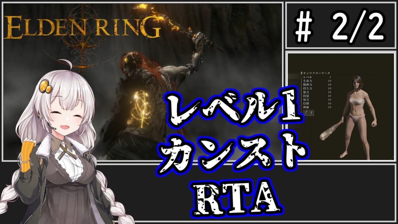 モーゴット戦後~エンディングまで<br><br>RTA初挑戦です。<br><br>・エルデンリングのネタバレを含みます。<br>・SL1でカンスト難易度(8周目以降)のクリアを目指します。<br>・biimシステムを使用しています。<br>・VOICEROID、A.I.VOICEを使用しています。<br>・ver1.09でのプレイ動画です。<br>・タイマーは後付けです。<br><br><strong><a href="https://www.nicovideo.jp/watch/sm42178086" class="watch">sm42178086</a>←前(1/2)<br><br>前回のレベル1攻略解説→</strong><a href="https://www.nicovideo.jp/watch/sm41849179" class="watch">sm41849179</a><br><strong>前々回のシリーズのレベル1で王になりたいあかりちゃん</strong>→<a href="https://www.nicovideo.jp/series/328309" target="_blank" rel="noopener">series/328309</a><br><span style="color: #262626;"><strong>前々々回のシリーズの知力しか上げられないゆかりさん</strong></span><span style="color: #262626;">→</span><a href="https://www.nicovideo.jp/series/312150" target="_blank" rel="noopener">series/312150</a><br><br>