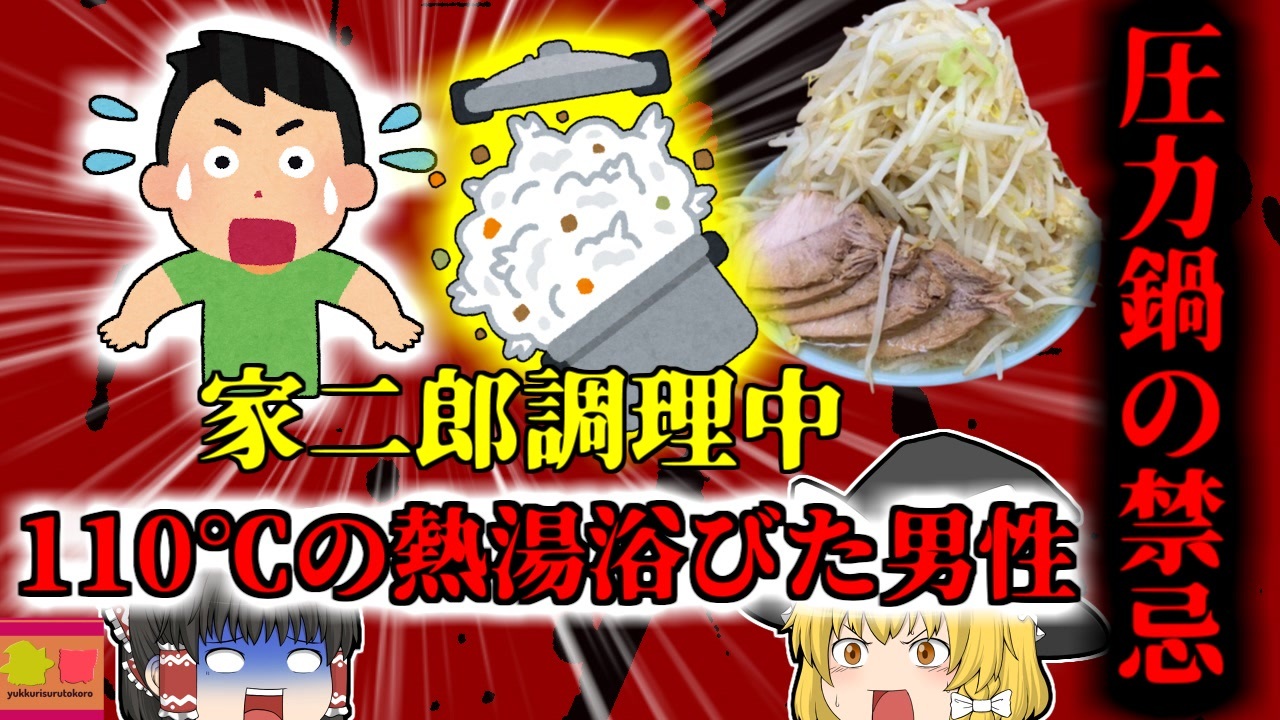 <a href="#" class="seekTime" data-seekTime="00:00" onclick="seekNicoPlayer('#00:00'); return false;">#00:00</a> 冒頭挨拶<br><a href="#" class="seekTime" data-seekTime="00:22" onclick="seekNicoPlayer('#00:22'); return false;">#00:22</a> 視聴上の注意<br><a href="#" class="seekTime" data-seekTime="00:58" onclick="seekNicoPlayer('#00:58'); return false;">#00:58</a> 本編開始<br><a href="#" class="seekTime" data-seekTime="1:26" onclick="seekNicoPlayer('#1:26'); return false;">#1:26</a> 二郎好きの男性「Aさん」<br><a href="#" class="seekTime" data-seekTime="2:32" onclick="seekNicoPlayer('#2:32'); return false;">#2:32</a> 圧力鍋で作ってみることに<br><a href="#" class="seekTime" data-seekTime="3:37" onclick="seekNicoPlayer('#3:37'); return false;">#3:37</a> 圧力鍋の仕組み<br><a href="#" class="seekTime" data-seekTime="5:49" onclick="seekNicoPlayer('#5:49'); return false;">#5:49</a> 突然鍋の蓋が…<br><a href="#" class="seekTime" data-seekTime="6:45" onclick="seekNicoPlayer('#6:45'); return false;">#6:45</a> 熱傷<br><a href="#" class="seekTime" data-seekTime="7:03" onclick="seekNicoPlayer('#7:03'); return false;">#7:03</a> いくつかの原因<br><a href="#" class="seekTime" data-seekTime="8:54" onclick="seekNicoPlayer('#8:54'); return false;">#8:54</a> ”やってはいけないこと”<br><a href="#" class="seekTime" data-seekTime="9:46" onclick="seekNicoPlayer('#9:46'); return false;">#9:46</a> 予防方法<br><br>今回紹介するのは、以前リクエストがありました、一般家庭の台所での事例です。<br>関東地方某都市に暮らす、会社員男性の「Aさん」はこの日、自宅待機の期間を利用し、大好きなラーメンを家で再現してみようと、圧力鍋でスープづくりをしていました。<br>彼は所謂「二郎系ラーメン」が大好きで、その味を再現してみようと考えました。<br>ネットで公開されている、様々な再現レシピを調べ、その中のとあるサイトで、圧力鍋を使えば簡単にスープを作ることができるということを知り、家にあった圧力鍋を引っ張り出してきて、「家二郎」を作ることに。<br>ネットで麺を打つパスタマシンや、豚骨などの材料を購入し、早速調理に取り掛かったAさん。<br>しかし、鍋でスープを加圧していた最中、突然圧力鍋が爆発し、彼の顔面に襲い掛かってきました。<br>高温状態となったスープが、顔面や頭など、上半身に勢いよく飛び掛かり、彼は広範囲にわたって熱傷を負ってしまいました。<br>彼はその後、救急車で近くの病院へと搬送されて行き、そのまま入院。<br>約一か月間の治療を受けましたが、命に別状はありませんでした。<br><br>何故、彼の圧力鍋は突然爆発してしまっていたのでしょうか?<br>実はAさんはあの時、「絶対にやってはいけないあること」をしてしまっていたのです。<br><br>引用・出展・参考文献<br>消費者庁 圧力鍋を安全に正しく使いましょう<br><a href="https://ishort.ink/sbq1" target="_blank" rel="noopener nofollow">https://ishort.ink/sbq1</a><br>Panasonic なぜ骨まで柔らかくなる?圧力鍋の仕組みと原理<br><a href="https://ishort.ink/EUcE" target="_blank" rel="noopener nofollow">https://ishort.ink/EUcE</a><br>アサヒ軽金属 お料理初心者でも安心!圧力鍋の使い方 - アサヒ軽金属<br><a href="https://ishort.ink/vFBy" target="_blank" rel="noopener nofollow">https://ishort.ink/vFBy</a><br><br>その他視聴者提供資料など<br><br><br />※この動画は過去の事件を知り、現在でも同じことが発生する危険性を再認識、関与しないように促すための動画であり、視聴者を扇動、動揺を誘うためのコンテンツではありません。<br><br>ご要望にお応えして、メンバーシップの開設を行いました。<br>下記URLからも登録可能ですので、ご興味がある方は是非ご参加ください。<br><a href="https://www.youtube.com/channel/UCcT5a1J7XJW7CLYI2RKl4pw/join" target="_blank" rel="noopener nofollow">https://www.youtube.com/channel/UCcT5a1J7XJW7CLYI2RKl4pw/join</a><br><br><br>Twitter<br>→<a href="https://twitter.com/yukkurisurutoko" target="_blank" rel="noopener nofollow">https://twitter.com/yukkurisurutoko</a><br><br>取り急ぎ、簡易的にですがマイリストを作りました。<br>【ゆっくり解説】事故・事件関係紹介リスト <br><a href="https://www.nicovideo.jp/mylist/71034319" target="_blank" rel="noopener nofollow">https://www.nicovideo.jp/mylist/71034319</a><br>【ゆっくり解説】放射線系事故<br><a href="https://www.nicovideo.jp/mylist/71034368" target="_blank" rel="noopener nofollow">https://www.nicovideo.jp/mylist/71034368</a><br>【ゆっくり解説】鉄道系事故・事件関連<br><a href="https://www.nicovideo.jp/mylist/71034379" target="_blank" rel="noopener nofollow">https://www.nicovideo.jp/mylist/71034379</a>