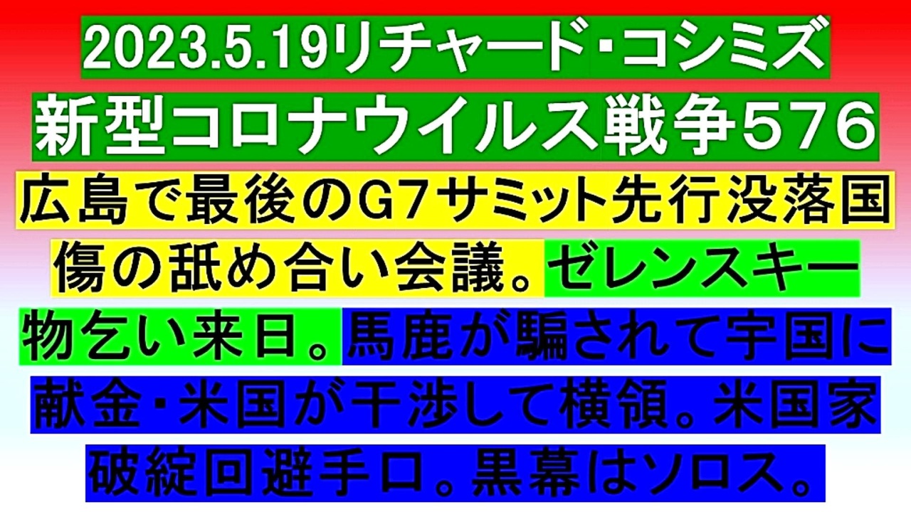 <span style="color: #cc4125;"><strong>「 テーマ : 新型コロナウイルス戦争 576 」</strong></span><br><br><span style="color: #ff0000;"><strong>「『 広島 』で『 最後 』の『 G7サミット先行没落国傷の舐め合い会議 』。『 ゼレンスキー物乞い来日 』。<br> 『 馬鹿 』が騙されて『 宇国に献金 』・『 米国が干渉して横領 』。『 米国家破綻回避手口 』。<br> 『 黒幕 』は『 ジョージ・ソロス 』」</strong></span><br><br><span style="color: #0000ff;"><strong>「『 イベルメクチン・アビガン・その他コロナ対策 』について、ご意見をお寄せ下さい! 」<br><br> ◐ E-mail:richardkoshimizu@gmail.com</strong></span><br><br><strong>◐「クリエイター・サポート」・「ニコニ広告」・「フォロー」等、ご協力の程宜しくお願い致します。RK</strong><br><br><span style="color: #38761d;"><strong>◐ リチャード・コシミズ 講演会 公式 動画ギャラリー</strong></span><br> <span style="color: #38761d;"><strong><a href="http://www.t-sskk.com/richardkoshimizu/video-gallery/index.html" target="_blank" rel="noopener nofollow">http://www.t-sskk.com/richardkoshimizu/video-gallery/index.html</a><br><br>◐ リチャード・コシミズ 講演会 「 ニコニコ生放送『 LIVE 』」</strong></span><br> <span style="color: #38761d;"><strong><a href="https://bit.ly/3Bx8F5w" target="_blank" rel="noopener nofollow">https://bit.ly/3Bx8F5w</a><br><br>◐ リチャード・コシミズ 公式 ブログ</strong></span><br> <span style="color: #38761d;"><strong><a href="http://08054623210.jugem.jp/" target="_blank" rel="noopener nofollow">http://08054623210.jugem.jp/</a><br><br>◐ リチャード・コシミズ 公式 ホームページ<br> <a href="http://richardkoshimizu.boo.jp/" target="_blank" rel="noopener nofollow">http://richardkoshimizu.boo.jp/</a></strong></span><br>