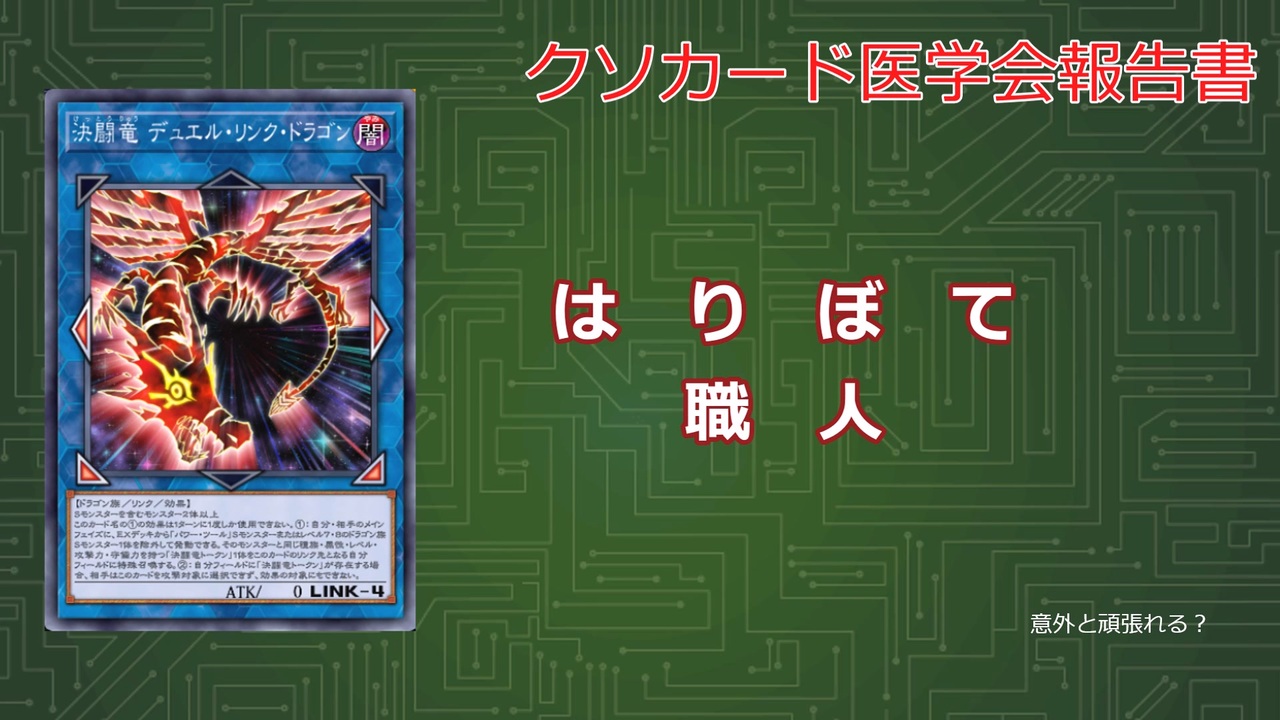 2本目です<br><br>前回の本家医学会にて同じく治療を行っていた先駆者様がおられたのですが治療法が異なっていたようなので気にせず投稿することにしました。<br><br>たとえ重篤患者ではなくとも…と思っていたのですが考察すればするほどあちこちに色んな症状が見つかって普通に重症でした。<br><br>これでもハリファイバーやスカルデットより後に産まれたそうですよ。<br><br><br><br>動画時間が長すぎるかも?と思い試験的に読み上げ速度を1.2倍速にしてみました。<br>聞き取りにくければ戻します。<br><br>アニソンで会話する男さん 0/0さん 越冬星さん ゲストさん Kaisuさん ともとさん 運命計画さん あねはすさん<br>広告ありがとうございます!<br><br>本家あまくだり氏がなんと別の方法でこのカードの治療に着手してくださいました!<br>個人的にも大いに参考になったので興味を持って下さった方は是非一度視聴してみてください。<br>(自分のような新米が勝手に宣伝するのもあれなのでリンクは控えさせていただきます)<br><br>コメント、いいね、マイリスしていただけると励みになります。<br><br>あまくだり氏リスペクトです<br><br>使用音源<br>ニコニ・コモンズ<br><br>編集ソフト<br>ゆっくりムービーメーカー4<br><br>使用楽曲<br>Funky droll street (蒲鉾さちこ様)<br>荒野のデュエリスト (遊戯王5D'SWCS2011DS)<br><br>前≫<a href="https://www.nicovideo.jp/watch/sm42217043" class="watch">sm42217043</a>「No.48 シャドー・リッチ」<br>次≫<a href="https://www.nicovideo.jp/watch/sm42332622" class="watch">sm42332622</a>「決闘竜-デュエル・リンク・ドラゴン」追加報告