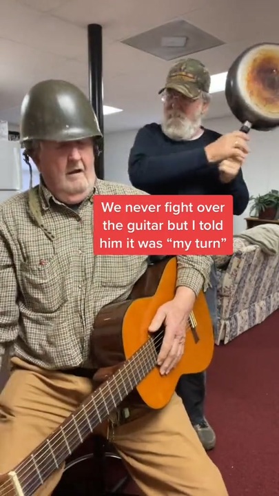 ホモと見るフライパンで頭を叩かれながらギターを演奏するおじいさん