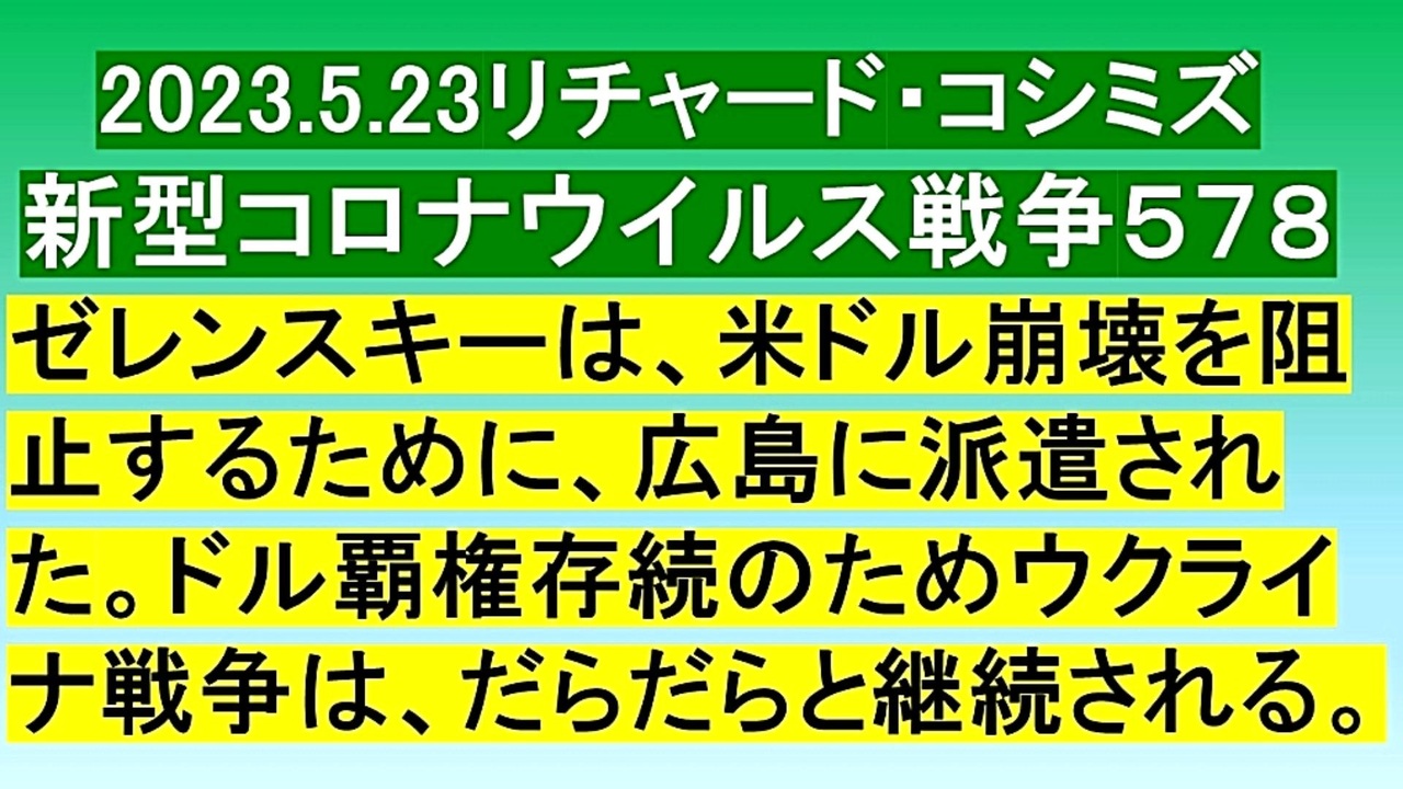 <span style="color: #cc4125;"><strong>「 テーマ : 新型コロナウイルス戦争 578 」( 前半 )</strong></span><br><br><span style="color: #ff0000;"><strong>「『 ゼレンスキー 』は、『 米ドル崩壊 』を『 阻止 』するために、『 広島 』に『 派遣 』された。『 ドル<br> 覇権存続 』のため『 ウクライナ戦争 』は、だらだらと『 継続 』される 」</strong></span><br><br><span style="color: #0000ff;"><strong>「『 イベルメクチン・アビガン・その他コロナ対策 』について、ご意見をお寄せ下さい! 」<br><br> ◐ E-mail:richardkoshimizu@gmail.com</strong></span><br><br><strong>◐「クリエイター・サポート」・「ニコニ広告」・「フォロー」等、ご協力の程宜しくお願い致します。RK</strong><br><br><span style="color: #38761d;"><strong>◐ リチャード・コシミズ 講演会 公式 動画ギャラリー</strong></span><br> <span style="color: #38761d;"><strong><a href="http://www.t-sskk.com/richardkoshimizu/video-gallery/index.html" target="_blank" rel="noopener nofollow">http://www.t-sskk.com/richardkoshimizu/video-gallery/index.html</a><br><br>◐ リチャード・コシミズ 講演会 「 ニコニコ生放送『 LIVE 』」</strong></span><br> <span style="color: #38761d;"><strong><a href="https://bit.ly/3Bx8F5w" target="_blank" rel="noopener nofollow">https://bit.ly/3Bx8F5w</a><br><br>◐ リチャード・コシミズ 公式 ブログ</strong></span><br> <span style="color: #38761d;"><strong><a href="http://08054623210.jugem.jp/" target="_blank" rel="noopener nofollow">http://08054623210.jugem.jp/</a><br><br>◐ リチャード・コシミズ 公式 ホームページ<br> <a href="http://richardkoshimizu.boo.jp/" target="_blank" rel="noopener nofollow">http://richardkoshimizu.boo.jp/</a><br><br>◐ リチャード・コシミズ 公式 Twitter</strong></span><br> <span style="color: #38761d;"><strong><a href="https://twitter.com/rickoshimizu" target="_blank" rel="noopener nofollow">https://twitter.com/rickoshimizu</a></strong></span>