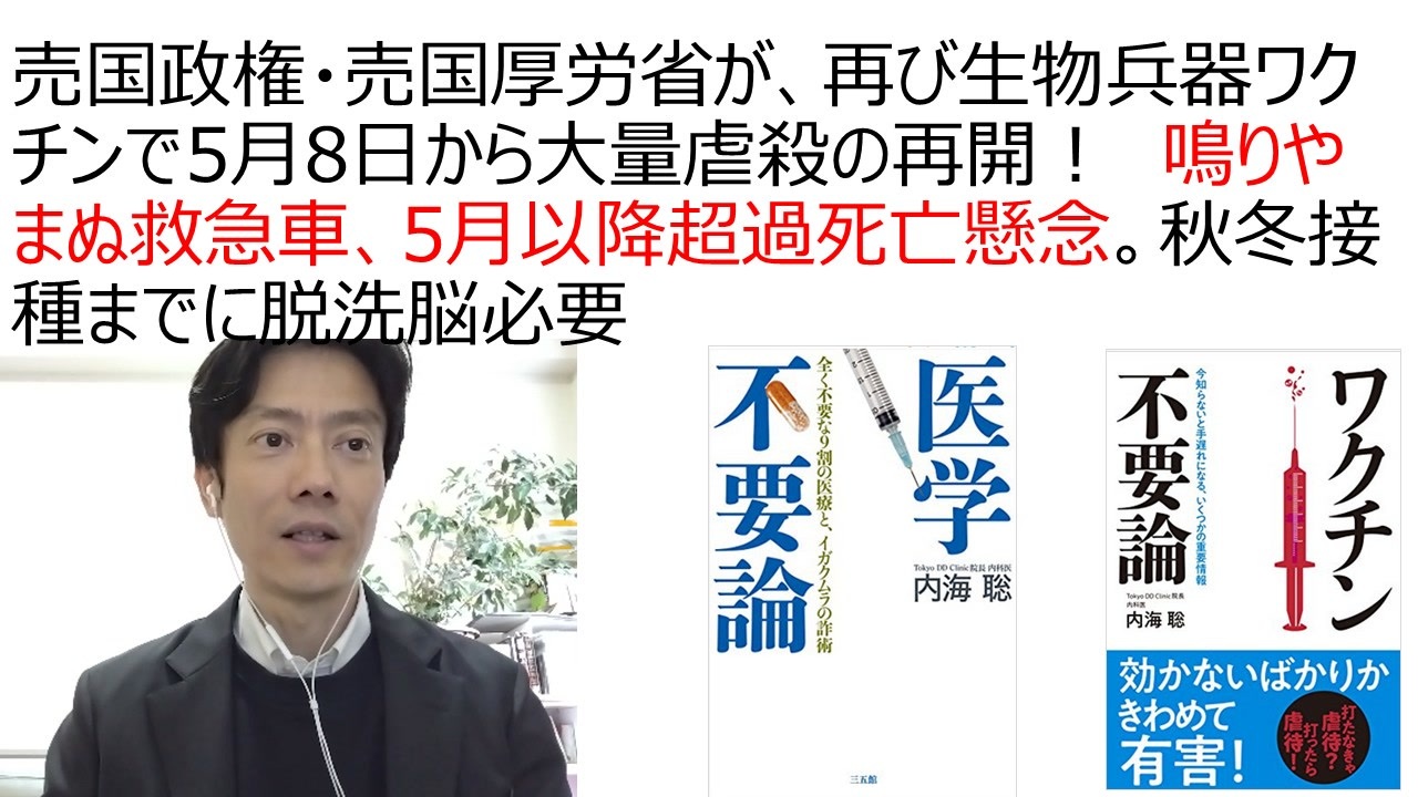 生物兵器ワクチン接種回数 首相官邸<br><a href="https://www.kantei.go.jp/jp/headline/kansensho/vaccine.html" target="_blank" rel="noopener nofollow">https://www.kantei.go.jp/jp/headline/kansensho/vaccine.html</a><br><br>先日、救急車の音がまた増えてきているというお話をしました。これは生物兵器ワクチンの接種が5/8から再び活性化したことに影響があると思います。接種回数と救急車が鳴る音と超過死亡は確実に相関関係があり、因果関係もあると考えます。<br>私は22年9月16日から23年3月2日まで2週間ずつ毒ちん接種回数を定点観測し動画にしていました。それを再開しようと思います。<br> 首相官邸の毒チン接種回数の表記は、毎日公開から1週間ごとの公開に変更されました。従来株とオミクロン株という表示形式も変更。過去からの累積接種回数と、令和五年5月8日以降3回め以上とに分けている。製薬会社様への報告形式を効果得たということだと思っています。 全体総数については4回以上でくくっており、詳細はエクセルでしか分かりません。<br>以前、指摘しましたように、81.3%あった、そう接種回数の1回目比率が81.1と下がっている。なぜか不明。死者の数が影響していると思います。分母から抜くだけなら率は上がるはずですが、どのようにワクチン死者数を扱っているのでしょう。<br> 1回目2回目を打った人は9.2万人。3回目以上が324万人です。合計334万人。たった2週間で、死ぬ可能性が高くなった人たちが334万人も増えたということです。334万人という数は、超過死亡を押し上げるのに十分な人数です。<br>詳細エクセルを見ると、1回目2回目は従来株と武田ノババックス、3回目以上は全て二価になりました。3月2日時点でも、尾身型と従来株が3回目以上でも半分半分でした。生産サイドが二価をメインにしだしたことが伺えます。同様に各社ba1の在庫が減少し、ba5がメインになりつつあります。<br>