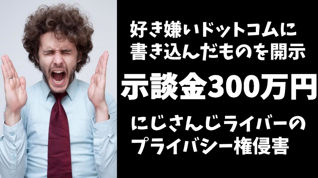 2023年5月25日、にじさんじを運営するANYCOLOR株式会社公式ツイッターより、好き嫌いドットコムと思われるサイトの所属タレントに関する書き込みをしたものを開示し300万円以上の損害賠償金を支払う形で示談が成立したとの発表がありました。<br><br>引用<br><a href="https://twitter.com/ANYCOLOR_Inc/status/1661567806335520770" target="_blank" rel="noopener nofollow">https://twitter.com/ANYCOLOR_Inc/status/1661567806335520770</a><br><br>Youtube <a href="https://www.youtube.com/@V_Virgin_Mary" target="_blank" rel="noopener nofollow">https://www.youtube.com/@V_Virgin_Mary</a><br>twitter <a href="https://twitter.com/V_Virgin_Mary" target="_blank" rel="noopener nofollow">https://twitter.com/V_Virgin_Mary</a><br><br>使用素材<br>高品質なフリー動画素材 - Pixabay <a href="https://pixabay.com/ja/videos" target="_blank" rel="noopener nofollow">https://pixabay.com/ja/videos</a>