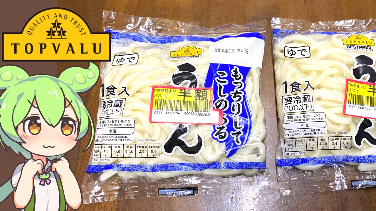 ゆでうどんが半額の1玉9円で買えました。<br><br>【参考】<br>もっちりしてこしのあるうどん<br><a href="https://www.topvalu.net/items/detail/4901810926206/" target="_blank" rel="noopener nofollow">https://www.topvalu.net/items/detail/4901810926206/</a><br>かつお節エキスと昆布エキス使用そうめんつゆストレート<br><a href="https://www.topvalu.net/items/detail/4549741943192/" target="_blank" rel="noopener nofollow">https://www.topvalu.net/items/detail/4549741943192/</a><br>盛田株式会社<br><a href="http://moritakk.com/" target="_blank" rel="noopener nofollow">http://moritakk.com/</a><br><br>【使用した素材】(※敬称略)<br>(合成音声)VOICEVOX/ずんだもん/四国めたん<br><a href="https://voicevox.hiroshiba.jp/" target="_blank" rel="noopener nofollow">https://voicevox.hiroshiba.jp/</a><br>(立ち絵)坂本アヒル<br><a href="https://seiga.nicovideo.jp/seiga/im10788496" target="_blank" rel="noopener">im10788496</a>/<a href="https://seiga.nicovideo.jp/seiga/im10791276" target="_blank" rel="noopener">im10791276</a><br>(楽曲)甘茶の音楽工房/「楽しい麦畑」「フルーツパフェ」<br><a href="https://amachamusic.chagasi.com" target="_blank" rel="noopener nofollow">https://amachamusic.chagasi.com</a><br><br>【関連動画】<br>トップバリュの赤いヤツや黄色いヤツで作る「冷やし中華」<br><a href="https://www.youtube.com/watch?v=8twVqhXVdvw&t=5s&ab_channel=maryu4492" target="_blank" rel="noopener nofollow">https://www.youtube.com/watch?v=8twVqhXVdvw&t=5s&ab_channel=maryu4492</a>