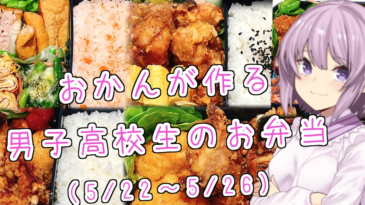 気圧と気温の変化で体調を崩すことが多く、お弁当作りも大変でした…<br>皆さんも体調には気をつけましょうね!<br><br><br>~2:58 お弁当紹介<br>2:59~ 調理工程<br><br><br>【☆お借りした素敵な素材☆(順不同)】<br><br>【立ち絵】<br>ゆかりおかん:ヤッペン 様<br>タカハシ :MtU 様<br><br><br>【素材】<br>ニコニ・コモンズ 様<br>フリーBGM:DOVA-SYNDROME 様<br>いらすとや 様<br><br><br>最後にこの動画を見てくださった皆様に心からの感謝と、<br>これからも良きご縁がありますように!(*´ω`*)<br><br><br>前作品:仙台牛食べてみた!【<a href="https://www.nicovideo.jp/watch/sm42240723" class="watch">sm42240723</a> 】<br>次回作:ゆかりおかんのお弁当紹介(5/29~6/2)【<a href="https://www.nicovideo.jp/watch/sm42311647" class="watch">sm42311647</a> 】<br><br><br>【ゆかりおかんのお弁当シリーズ】<br><a href="https://www.nicovideo.jp/series/401647" target="_blank" rel="noopener nofollow">https://www.nicovideo.jp/series/401647</a><br><br><br>Twitter:<a href="https://twitter.com/moegimon " target="_blank" rel="noopener nofollow">https://twitter.com/moegimon </a><br><br>you tube:<a href="https://www.youtube.com/channel/UCP2N3uBfzKEoqCGviIvs0Ew " target="_blank" rel="noopener nofollow">https://www.youtube.com/channel/UCP2N3uBfzKEoqCGviIvs0Ew </a><br><br>ご支援:<a href="https://www.amazon.co.jp/hz/wishlist/ls/ZBWL10H8ML75?ref_=wl_share" target="_blank" rel="noopener nofollow">https://www.amazon.co.jp/hz/wishlist/ls/ZBWL10H8ML75?ref_=wl_share</a>