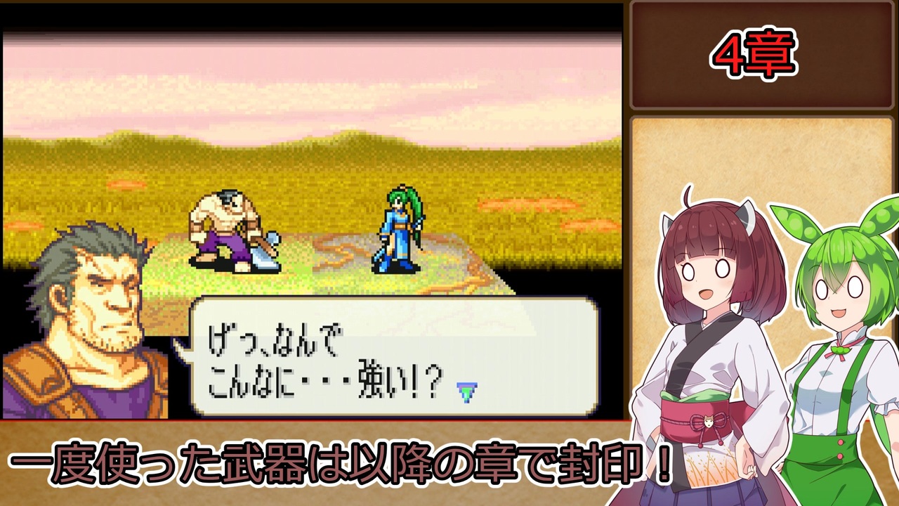 <span style="color: #85200c; font-size: 16px;"><strong><i>ちょっと動画時間短いかなと思いましたが<br>次の章をくっ付けちゃうと長過ぎたので4章オンリーです</i></strong></span><br><span style="color: #6aa84f; font-size: 16px;"><strong><i>のだ。</i></strong></span><br><br><strong>ルール1:一度使用した武器種は、以降の章で使用する事を禁止する。<br>ルール2:武器の使用の定義は『その武器を装備した状態で敵との戦闘が発生したタイミング』『その武器を売却して換金した場合』杖の場合は『対象に対して使用した時点(命中の可否は問わない)』とする。</strong><br><span style="color: #ff0000;"><strong>※同盟軍、演出による戦闘イベントでは使用した判定にはならないこととする。</strong></span><br><strong>ルール3:難易度はリン編ハード→ヘクトル編ハードとする。<br>ルール4:序章から終章まで外伝、異伝を含む全ての章を攻略し、仲間に出来るユニットは全員加入させ、生存させる。(序章と1章のみ同一の章として扱う)</strong><br><span style="color: #ff0000; font-size: 18px;"><strong>※バグ技禁止</strong></span><br><br>本動画のシリーズリスト【<a href="https://www.nicovideo.jp/series/406473" target="_blank" rel="noopener">series/406473</a>】<br>前作の同縛りプレイ【<a href="https://www.nicovideo.jp/series/316824" target="_blank" rel="noopener">series/316824</a>】<br>前:【<a href="https://www.nicovideo.jp/watch/sm42248464" class="watch">sm42248464</a>】次:【<a href="https://www.nicovideo.jp/watch/sm42311547" class="watch">sm42311547</a>】<br><br><strong>使用したソフト</strong><br>VOICEROID+東北きりたんEX<br>VOICEPEAK 東北きりたん<br>VOICEPEAK ずんだもん<br><strong>お借りした素材</strong><br>ニコニコモンズの皆様(コンテンツツリー参照)