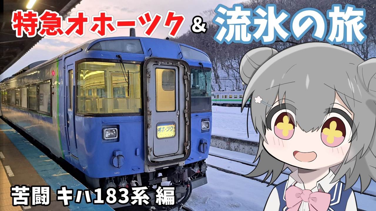 何番煎じか知らないけど…乗りたかったから許して!<br>引退直前のキハ183系特急「オホーツク」を使用して、網走まで流氷を見に行きます。撮影は2023年3月上旬です(ダイヤ改正前)。<br>前編は、札幌から網走まで「オホーツク」に乗車しましたので、車窓を眺めながらのんびり行きます。<br>中編で実際に流氷を見に行きました→<a href="https://www.nicovideo.jp/watch/sm42446618" class="watch">sm42446618</a><br /><br>よろしければ今までの投稿動画も見てください。 <br> 投稿動画一覧 <a href="https://www.nicovideo.jp/mylist/73587666" target="_blank" rel="noopener">mylist/73587666</a><br><br> ドライブ系(単発) <a href="https://www.nicovideo.jp/series/348689" target="_blank" rel="noopener">series/348689</a><br> 鉄道系 <a href="https://www.nicovideo.jp/series/481052" target="_blank" rel="noopener">series/481052</a><br> 道の駅スタンプラリー <a href="https://www.nicovideo.jp/series/346949" target="_blank" rel="noopener">series/346949</a><br> 動く立ち絵シリーズ <a href="https://www.nicovideo.jp/series/326086" target="_blank" rel="noopener">series/326086</a> <br>--------------------------------------<br>[今後の動画投稿予定]<br>次回:猿払村にホタテを食べに行くプチドライブ<br>以降候補:<br>・道の駅スタンプラリー 新作 1日目<br>・レンタカーで千里浜 後編<br>・紡乃世詞音ちゃんの単発動画<br><br>☆気になる動画がある方は見逃さないように是非フォローしてね!☆<br><br><a target="_blank" href="https://qa.nicovideo.jp/faq/show/19424?site_domain=default" style="font-size: 13px;color: #657586; text-decoration: underline; line-height: 1.4">この動画は投稿者によって修正されました</a>