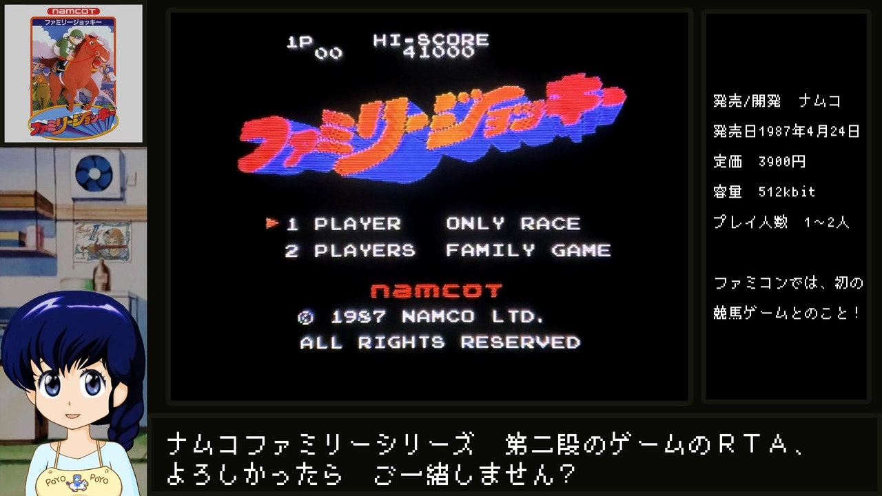 【ブラウン管テレビ】でのファミコンの映像を動画で綺麗に遺せないかな~って画策している動画でっす。<br><br>(でも、今回はダートコース時のモアレがちょっと酷いので、もし酔いそうとかだったら右枠でも見ていてください...)<br><br>(※1080pでの視聴を前提にしてるので、1920x1080未満のサイズだとモアレが更に酷くなる可能性がありまぁす)<br> <br>計測期間:ウマ選択~NICE RUN表示まで<br> <br>//参考文献<br>めぞん一刻 デジタルリマスター版<br> <a href="https://amzn.to/3ojH2WC" target="_blank" rel="noopener nofollow">https://amzn.to/3ojH2WC</a> <a href="https://amzn.to/3IVRFJd" target="_blank" rel="noopener nofollow">https://amzn.to/3IVRFJd</a> (49話~)<br>闘牌伝説アカギ<br> <a href="https://amzn.to/3MM0ffH" target="_blank" rel="noopener nofollow">https://amzn.to/3MM0ffH</a><br /> <br><br><span style="color: #e69138;">//共通説明文てすと</span><br><span style="color: #ff00ff;"><strong>【New!】</strong></span>F-ZERO RTA:<a href="https://www.nicovideo.jp/watch/sm45660939" class="watch">sm45660939</a><br>【New!】Romancing Sa・Ga2:<a href="https://www.nicovideo.jp/watch/sm44400984" class="watch">sm44400984</a> <br>【New!】らんま½爆烈乱闘篇RTA (WR):<a href="https://www.nicovideo.jp/watch/sm44178414" class="watch">sm44178414</a>(デバイス制限対策版: <a href="https://www.nicovideo.jp/watch/sm44432134" class="watch">sm44432134</a>)<br>【New!】スーパーファミスタRTA:<a href="https://www.nicovideo.jp/watch/sm43890432" class="watch">sm43890432</a><br>【New!】ファミコンRTA落とし穴可視化用アイコン:<a href="https://seiga.nicovideo.jp/seiga/im11438499" target="_blank" rel="noopener">im11438499</a>(←5月23日以降に投稿したのは消えちゃったぽい...?)<br><br>【直撮り】ブラウン管テレビでファミコンする管理人さん:<a href="https://www.nicovideo.jp/series/423780" target="_blank" rel="noopener">series/423780</a><br>【ミンサガ】RTAとか:<a href="https://www.nicovideo.jp/series/416017" target="_blank" rel="noopener">series/416017</a><br>【WS版FF2】RTA:<a href="https://www.nicovideo.jp/series/426767" target="_blank" rel="noopener">series/426767</a><br>【DEAD OR ALIVE】RTA:<a href="https://www.nicovideo.jp/series/79228" target="_blank" rel="noopener">series/79228</a><br>【バブルボブル】RTA:<a href="https://www.nicovideo.jp/series/366167" target="_blank" rel="noopener">series/366167</a><br><span style="font-size: 14px;">【アーケードアーカイブス】</span>RTA:<a href="https://www.nicovideo.jp/series/79229" target="_blank" rel="noopener">series/79229</a>