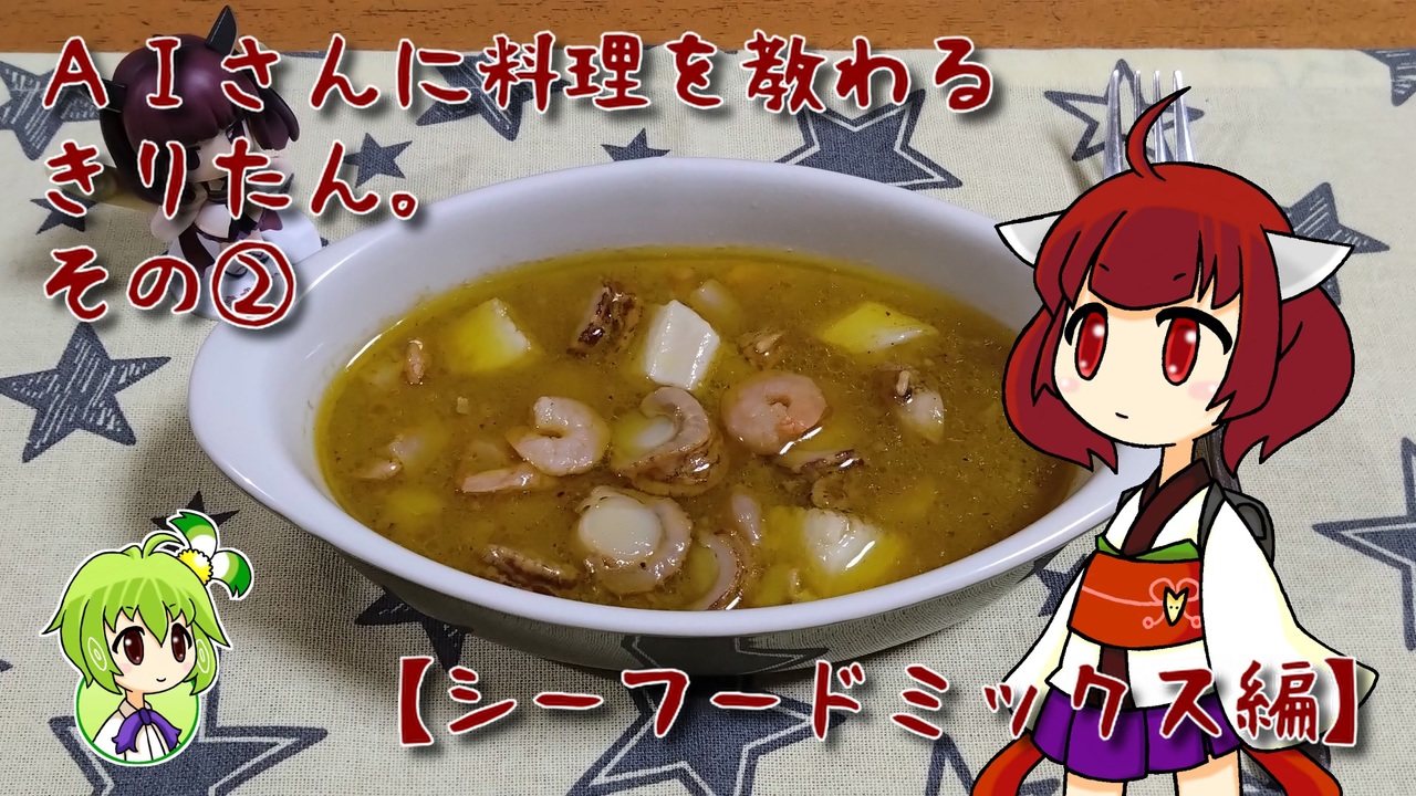 動画の趣旨と具体的な流れは前回(<a href="https://www.nicovideo.jp/watch/sm42247051" class="watch">sm42247051</a>)を参照してください。<br><br>BingAIにお嬢様言葉で回答してもらっているのは、もしも嘘をつかれたり料理に失敗した時に、「お嬢様の仰ることですから仕方ありませんわね」と自分を納得させるための措置です。<br>でも思ったより良識的なのですよね、AIお嬢様……。<br><br>※きりたんのレンジでチン! は、特記がない限り全て600ワットです。<br><br>AIが紹介したレシピと、AIが参考にしたと思われるレシピはこちら↓<br><a href="https://drive.google.com/file/d/1iNnThnseK9M7spQogGMgjUq4AS6y0-mo/view?usp=share_link" target="_blank" rel="noopener nofollow">https://drive.google.com/file/d/1iNnThnseK9M7spQogGMgjUq4AS6y0-mo/view?usp=share_link</a><br><a href="https://cookpad.com/recipe/2588341" target="_blank" rel="noopener nofollow">https://cookpad.com/recipe/2588341</a>