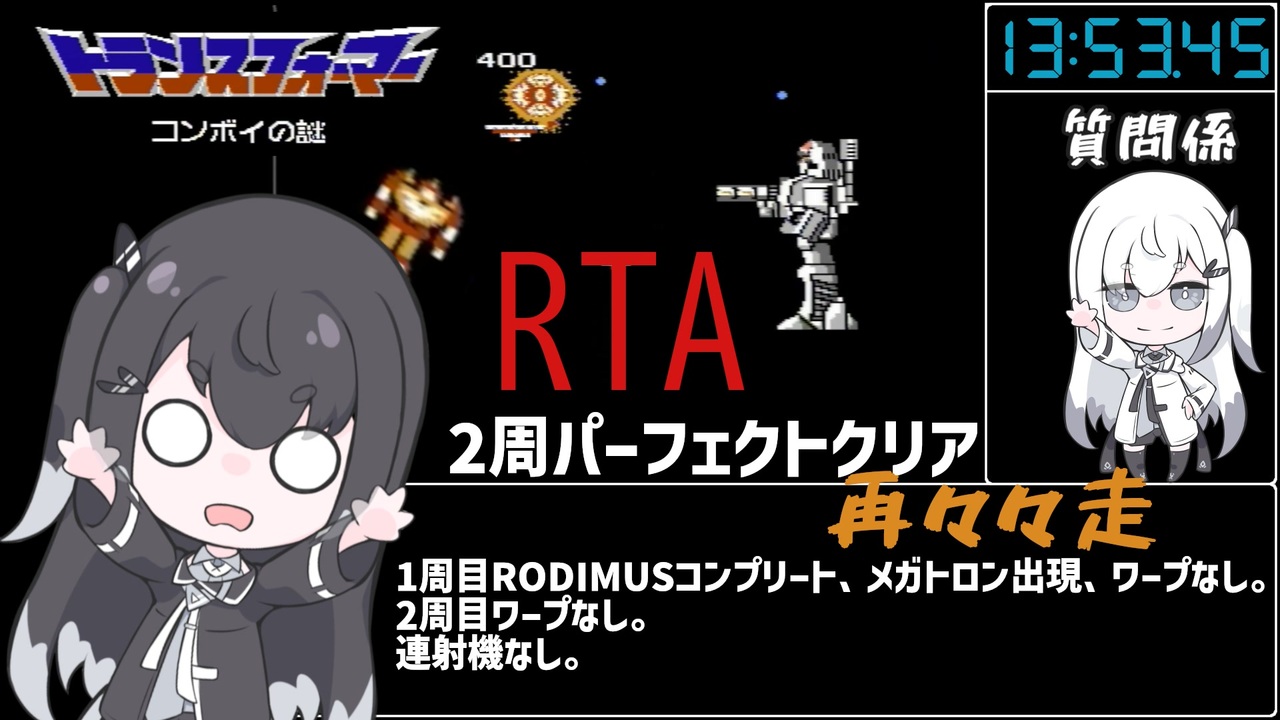今回はコメント返し回です。<br>コンボイの謎についての情報を引き続き募集しています。<br>どんな些細なことでもいいので、コメントに残していただければ幸いです。<br><br>地味にステージ5で新パターンを使っています。<br>ステージ4の新パターンはほぼ安定、9は調整中です。<br>まだまだ短縮できそうですね。<br><br>カテゴリ:1周目RODIMUSコンプリート、メガトロン出現、ワープなし。<br> 2周目ワープなし。<br>連射機なし。<br><br>無編集動画:<br> <br>完全攻略動画:<a href="https://www.nicovideo.jp/watch/sm41549759" class="watch">sm41549759</a><br><br>怪現象集:<a href="https://www.nicovideo.jp/watch/sm41545650" class="watch">sm41545650</a><br><br>ボイスはCoeFontミリアルさんとアリアルさんを使用させて頂きました。<br>Voiced by <a href="https://CoeFont.cloud" target="_blank" rel="noopener nofollow">https://CoeFont.cloud</a><br><br>立ち絵:梓音しのん様<br>ちんまいアリミリ姉妹立ち絵<br><a href="https://seiga.nicovideo.jp/seiga/im11025058" target="_blank" rel="noopener nofollow">https://seiga.nicovideo.jp/seiga/im11025058</a>