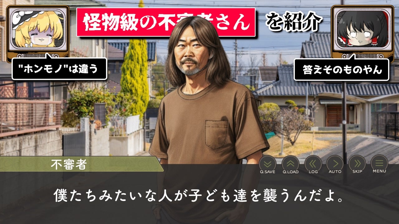 "それ"に出会ったら終わり。<br><br>✅使用ボイス<br>————————————————————————————<br>コエフォント:<a href="https://coefont.studio" target="_blank" rel="noopener nofollow">https://coefont.studio</a><br>VOICEVOX:ずんだもん、四国めたん、波音リツ、雨晴はう、冥鳴ひまり、玄野武宏、青山龍星、白上虎太郎、もち子(cv 明日葉よもぎ)、剣崎雌雄、春日部つむぎ<br>AquesTalk:<a href="https://www.a-quest.com/products/aquestalk.html" target="_blank" rel="noopener nofollow">https://www.a-quest.com/products/aquestalk.html</a><br><br><br>✅ゆっくり立ち絵<br>————————————————————————————<br>くまの巣様:<a href="https://www.youtube.com/channel/UCVMhSwMzJRbaMsvHdsCgu1g" target="_blank" rel="noopener nofollow">https://www.youtube.com/channel/UCVMhSwMzJRbaMsvHdsCgu1g</a><br>配布サイト:<a href="https://kumasannosozaiya.studio.site/" target="_blank" rel="noopener nofollow">https://kumasannosozaiya.studio.site/</a><br><br><br>✅オリジナルイラスト<br>————————————————————————————<br>うさ義様:<a href="https://touhopu2.fanbox.cc/posts/2214008" target="_blank" rel="noopener nofollow">https://touhopu2.fanbox.cc/posts/2214008</a><br>おしお様:<a href="https://twitter.com/shioqqq" target="_blank" rel="noopener nofollow">https://twitter.com/shioqqq</a><br>んてす。様:<a href="https://twitter.com/tess_0209" target="_blank" rel="noopener nofollow">https://twitter.com/tess_0209</a><br>あきたえり様:<a href="https://coconala.com/users/2811015" target="_blank" rel="noopener nofollow">https://coconala.com/users/2811015</a><br><br><br>✅その他の素材<br>————————————————————————————<br>きまぐれアフター背景素材置き場:<a href="https://k-after.at.webry.info/" target="_blank" rel="noopener nofollow">https://k-after.at.webry.info/</a><br>みんちりえ: <a href="https://min-chi.material.jp/" target="_blank" rel="noopener nofollow">https://min-chi.material.jp/</a> <br>暗黒工房:<a href="http://www.ankokukoubou.com/" target="_blank" rel="noopener nofollow">http://www.ankokukoubou.com/</a><br>空想曲線:<a href="https://kopacurve.blog.fc2.com/" target="_blank" rel="noopener nofollow">https://kopacurve.blog.fc2.com/</a><br><br><br>✅BGM<br>————————————————————————————<br>Weekend / zukisuzuki:<a href="https://zukisuzukibgm.com/weekend/" target="_blank" rel="noopener nofollow">https://zukisuzukibgm.com/weekend/</a><br>Moonside Howl / safu:<a href="https://safuworks.com/moonsidehowl/" target="_blank" rel="noopener nofollow">https://safuworks.com/moonsidehowl/</a><br>superstar / しゃろう:<a href="https://www.youtube.com/watch?v=HWsOivtPz-o&list=WL&index=11" target="_blank" rel="noopener nofollow">https://www.youtube.com/watch?v=HWsOivtPz-o&list=WL&index=11</a><br>アイキャッチ効果音:<a href="https://tam-music.com/wp-content/uploads/2015/09/soft-z02.mp3" target="_blank" rel="noopener nofollow">https://tam-music.com/wp-content/uploads/2015/09/soft-z02.mp3</a><br>※一部有料素材のため記載なし