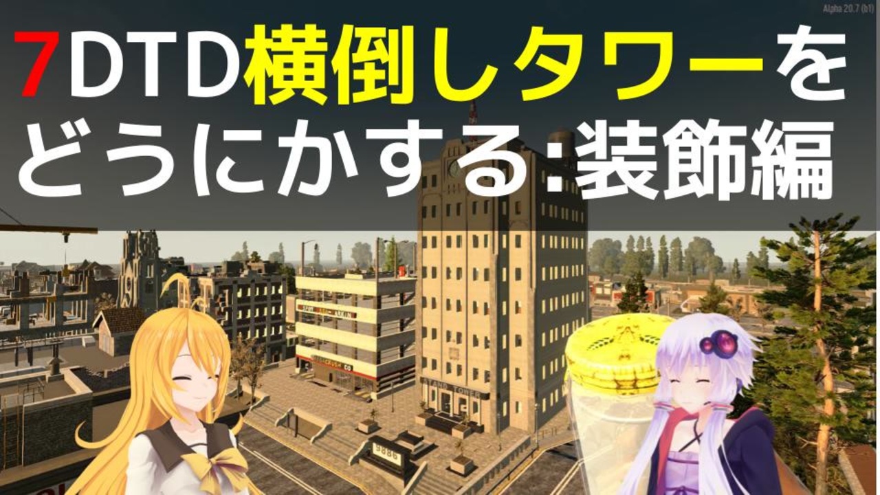 7 Days To Dieの動画で、α21がリリースされる前にα20の名所である横倒しタワーをどうにかするらしいです。<br>今回は装飾編で色々追加していきます。α21のリリースが遅れすぎて今回で完結です。<br><br><a href="#" class="seekTime" data-seekTime="00:00" onclick="seekNicoPlayer('#00:00'); return false;">#00:00</a> α21の前に横倒しタワーをどうにかする 装飾編<br><a href="#" class="seekTime" data-seekTime="00:55" onclick="seekNicoPlayer('#00:55'); return false;">#00:55</a> 劇的ビフォービフォー<br><a href="#" class="seekTime" data-seekTime="05:44" onclick="seekNicoPlayer('#05:44'); return false;">#05:44</a> 少々の事務連絡<br><br>【注意】<br>本動画は7 Days To Die α20.7です。<br>ネタバレ、チート・デバッグモードの多用<br>内部データであるXMLを参照、難易度設定等を頻繁に変更します<br>本動画を紹介頂ける場合はお手数をお掛けしますが動画idかURLを表記してください<br><br>【広告者様等】<br>うぽつ、おつ、コメント、いいねありがとうございます!<br>(英国面)ウェルロッド 様, 44MAN 様, binbougusa 様, DMP 様, DUPP&生アーキルー 様, foX 様, frege 様, gyokusai 様, Heliodor 様, jony_ash 様, joohn 様, kuro 様, mann 様, mo- 様, nagi 様, NINA 様, nor 様, NOVA 様, Oregano Maries 様, Rarespooky 様, ruutaso 様, TOWER 様, White_Cat 様, wrencat 様, いまかつ 様, うえけん 様, サーラちゃんさま小公国 様, さもん 様, しらろす 様, たたんた 様, つらら 様, てとら 様, ドラムカン・トーマス 様, ねこてー 様, ネコロビヤオキ 様, ビンテージ50 様, ふなもん 様, ヘビ君 様, マムシ 様, むらさき 様, もちおじ 様, もりもり 様, もるす 様, るし 様, ロンちゃん 様, 化石 様, 咲夜 様, 桜野キリエ 様, 三角州 様, 試製ガーリバス 様, 春昆布 様, 松乃信 様, 石ころ 様, 辻平SA 様, 同人ゲーム工房【陸前堂】 様, 微 様, 平塚の銘菓 様, 優陽 様, 雷鳥丸 様, 弩ラム缶 様, 彗狐 様<br><br>【エラータ】<br>何かあれば追加します。