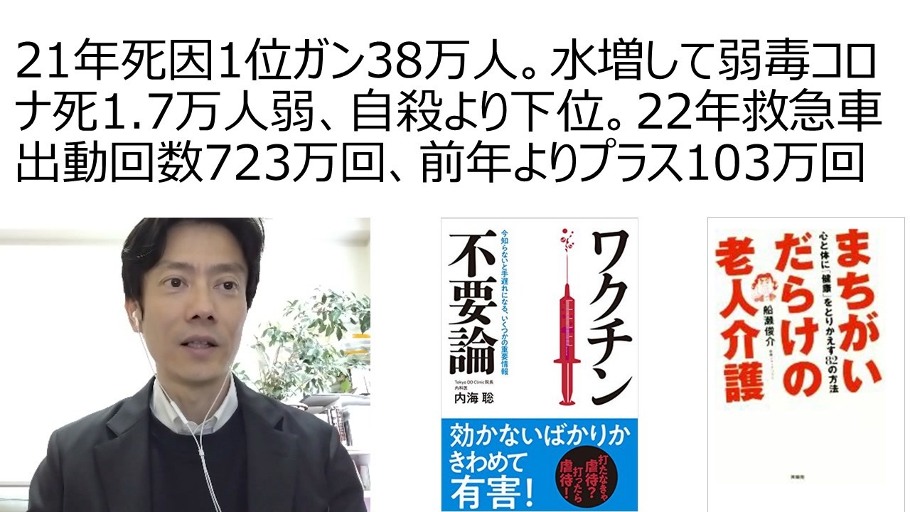 日本国独立宣言論 私は独立を宣言する! 真田信秋<br><a href="https://amzn.to/3D90lwx" target="_blank" rel="noopener nofollow">https://amzn.to/3D90lwx</a><br> <br>主権者命令書 主権破壊を許すな 売国傀儡日本政府を解体せよ<br><a href="https://amzn.to/49z51b5" target="_blank" rel="noopener nofollow">https://amzn.to/49z51b5</a><br> <br>マトリックス洗脳社会 グローバル企業ディストピア<br><a href="https://amzn.to/4g2YmZg" target="_blank" rel="noopener nofollow">https://amzn.to/4g2YmZg</a><br><br>死因順位 令和3年2021年の死亡数を死因順位別にみると、第1位は悪性新生物<腫瘍>で 38 万 1497 人(死亡率(人口 10 万対)は 310.7)、第2位は心疾患(高血圧性を除く)で 21 万 4623 人(同 174.8)、<br> 第3位は老衰で15 万 2024 人(同 123.8)、第4位は脳血管疾患で 10 万 4588 人(同 85.2)<br><br>肺炎は 7 万 3190 人で、新型コロナウイルス感染症は1万6756人となっている。うち8割以上はワクチン打って死んでおりワクチン死といえる可能性大。水増ししてたった1.7弱万人。<br>コロナ死の1.7万人弱で騒ぐなら、ガン若しくはガン治療で殺されている38万人の人のことも騒ぐべきではないですか。しかも50歳未満はコロナ死ゼロとイスラエル保険省<br><a href="https://www.mhlw.go.jp/toukei/saikin/hw/jinkou/geppo/nengai21/dl/gaikyouR3.pdf" target="_blank" rel="noopener nofollow">https://www.mhlw.go.jp/toukei/saikin/hw/jinkou/geppo/nengai21/dl/gaikyouR3.pdf</a><br><br>自殺は平成15年(2003年)万4千人でピークからは減少。驚くことに10歳から34歳では死因の1位。<br>2022年の自殺者数が2万1584人となったことが20日、警察庁の自殺統計(速報値)に基づく厚生労働省のまとめで分かった。21年の確定値と比べ577人増え、2年ぶりの増加(21年は2万1007名)。新型コロナウイルスの国内流行前は10年連続で減り19年に約2万人。少なくとも弱小コロナより自殺の方が継続的に社会問題として取り組むえき課題 <a href="https://www.npa.go.jp/safetylife/seianki/jisatsu/R04/R3jisatsunojoukyou.pdf" target="_blank" rel="noopener nofollow">https://www.npa.go.jp/safetylife/seianki/jisatsu/R04/R3jisatsunojoukyou.pdf</a><br><br>2022年1年間に全国で救急車が出動した件数はおよそ723万件と、初めて700万件を超え過去最多となりました。総務省消防庁は新型コロナウイルスの感染拡大の影響で出動件数大幅増加<br>総務省消防庁のまとめ 2022年1年間に全国で救急車が出動した件数は722万9838件と前の年に比べて103万件余り増え過去最多更新<br><a href="https://www3.nhk.or.jp/news/special/coronavirus/category5/detail/detail_35.html" target="_blank" rel="noopener nofollow">https://www3.nhk.or.jp/news/special/coronavirus/category5/detail/detail_35.html</a><br><br>