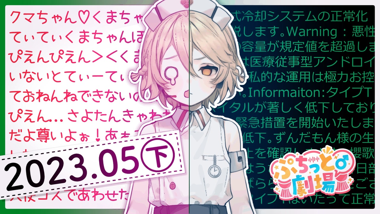 梅雨ですね。湿気で蒸れた女児脇。いちこです。<br><br>いちこ家のゆかいな仲間たちが言葉のドッジボールを繰り広げる ソフトウェアトーク劇場です。<br>Youtubeで2023年05月下半期に投稿していた作品を1つにまとめました。<br><br><br>前⇒【<a href="https://www.nicovideo.jp/watch/sm42239121" class="watch">sm42239121</a>】<br>次⇒【腕】<br>最初⇒【<a href="https://www.nicovideo.jp/watch/sm35616419" class="watch">sm35616419</a>】<br><br><br>◇ファンアートは<span style="color: #0000ff;"><strong>「#ぷぁーと」</strong></span>のハッシュタグで!!よろしくお願します!<br><a href="https://seiga.nicovideo.jp/clip/2203413" target="_blank" rel="noopener">clip/2203413</a><br><br><span style="color: #262626;">◇</span><span style="color: #262626;"><strong>ぷちっと劇場</strong></span><span style="color: #262626;">-毎日更新中</span><br><a href="https://www.youtube.com/channel/UCgea7Q2vvlHAaEnx1T-P5xw/videos" target="_blank" rel="noopener nofollow">https://www.youtube.com/channel/UCgea7Q2vvlHAaEnx1T-P5xw/videos</a><br><br>◇ぷ劇のお題箱を募集中<br><a href="https://forms.gle/qh33EcubqXDMbowc7" target="_blank" rel="noopener nofollow">https://forms.gle/qh33EcubqXDMbowc7</a><br><br>◇活動場所<br>Youtube➡<a href="https://www.youtube.com/@hatsune_ichico" target="_blank" rel="noopener nofollow">https://www.youtube.com/@hatsune_ichico</a><br>Twitter ➡ <a href="https://twitter.com/hatsune_ichico" target="_blank" rel="noopener nofollow">https://twitter.com/hatsune_ichico</a><br><br><br>◇VOICEVOX<br><a href="https://voicevox.hiroshiba.jp/" target="_blank" rel="noopener nofollow">https://voicevox.hiroshiba.jp/</a><br><br><br>