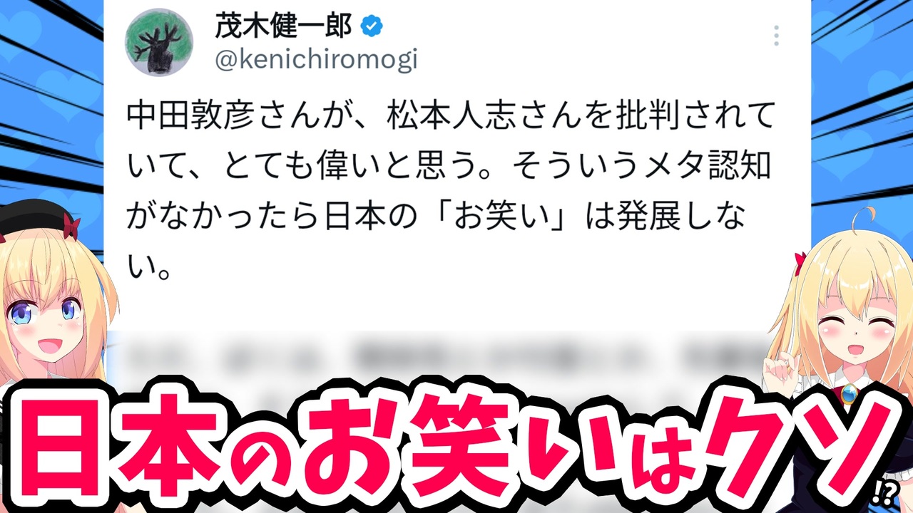 【ユーチューブで見る】<a href="https://youtu.be/iF4rKeZ849Q" target="_blank" rel="noopener nofollow">https://youtu.be/iF4rKeZ849Q</a><br>【引用元】<br><a href="https://twitter.com/kenichiromogi/status/1663166662340927488" target="_blank" rel="noopener nofollow">https://twitter.com/kenichiromogi/status/1663166662340927488</a> <br>ぼくが日本の「お笑い」に興味をなくした理由 <a href="https://www.youtube.com/watch?v=FwaQoGrlpqw" target="_blank" rel="noopener nofollow">https://www.youtube.com/watch?v=FwaQoGrlpqw</a><br />【サブチャンネル】<a href="https://www.youtube.com/channel/UCNeJoEWLt0jeZ0n5lDFalJg?sub_confirmation=1" target="_blank" rel="noopener nofollow">https://www.youtube.com/channel/UCNeJoEWLt0jeZ0n5lDFalJg?sub_confirmation=1</a> <br><br>【素材など、よくお世話になっているサイト(敬称略)】<br>BGMer <a href="https://bgmer.net" target="_blank" rel="noopener nofollow">https://bgmer.net</a><br>いらすとや <a href="https://www.irasutoya.com/" target="_blank" rel="noopener nofollow">https://www.irasutoya.com/</a><br>イラストAC <a href="https://www.ac-illust.com/" target="_blank" rel="noopener nofollow">https://www.ac-illust.com/</a><br>photoAC <a href="https://www.photo-ac.com/" target="_blank" rel="noopener nofollow">https://www.photo-ac.com/</a><br>効果音ラボ <a href="https://soundeffect-lab.info/" target="_blank" rel="noopener nofollow">https://soundeffect-lab.info/</a><br>DOVA-SYNDROME <a href="https://dova-s.jp/" target="_blank" rel="noopener nofollow">https://dova-s.jp/</a><br>甘茶の音楽工房 <a href="http://amachamusic.chagasi.com/index.html" target="_blank" rel="noopener nofollow">http://amachamusic.chagasi.com/index.html</a><br>魔王魂 <a href="https://maoudamashii.jokersounds.com/" target="_blank" rel="noopener nofollow">https://maoudamashii.jokersounds.com/</a><br>ニコニ・コモンズ <a href="https://commons.nicovideo.jp/" target="_blank" rel="noopener nofollow">https://commons.nicovideo.jp/</a><br><br>★BGM★<br>Happy Smile Paura - Music by Mixtery<br><a href="https://mix-mastery.stores.jp" target="_blank" rel="noopener nofollow">https://mix-mastery.stores.jp</a><br> ※本動画ではパウラちゃんねる専用BGMを使用しています。 <br><br>#パウラちゃんねる <br><br>当チャンネルはAmazon.co.jpを宣伝しリンクすることによって紹介料を獲得できる手段を提供することを目的に設定されたアフィリエイトプログラムである、Amazonアソシエイト・プログラムの参加者です。