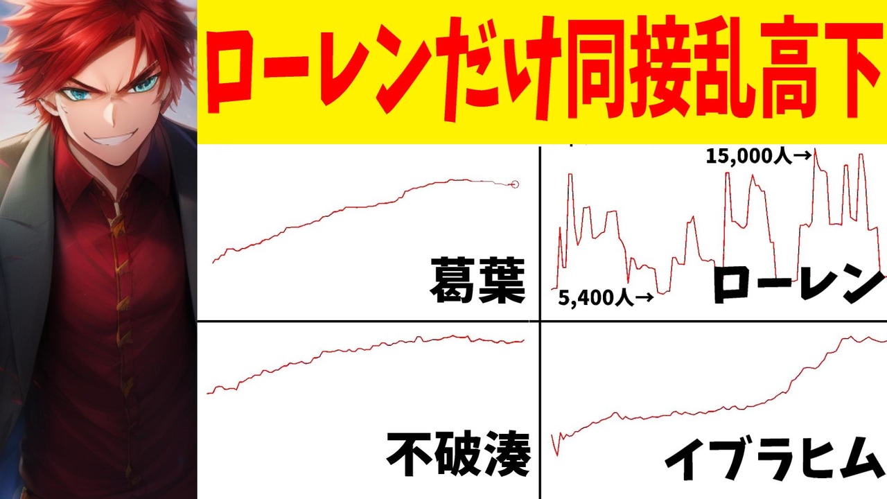 2023年6月4日にじさんじのローレン・イロアスが、同じくにじさんじの葛葉さん、不破湊さん、イブラヒムさんとコラボ配信をしたのですが何故か一人だけ同時視聴者数が5400~15000の間を激しく乱高下する異様な事態になっているとして話題です。他の配信者で同様の状態になったのは確認されていません。<br><br>引用<br>ぶいらび <a href="https://vrabi.net/" target="_blank" rel="noopener nofollow">https://vrabi.net/</a><br><a href="https://twitter.com/Lauren_iroas/status/1665332678617358339" target="_blank" rel="noopener nofollow">https://twitter.com/Lauren_iroas/status/1665332678617358339</a><br><br>Youtube <a href="https://www.youtube.com/@V_Virgin_Mary" target="_blank" rel="noopener nofollow">https://www.youtube.com/@V_Virgin_Mary</a><br>twitter <a href="https://twitter.com/V_Virgin_Mary" target="_blank" rel="noopener nofollow">https://twitter.com/V_Virgin_Mary</a><br><br>使用素材<br>高品質なフリー動画素材 - Pixabay <a href="https://pixabay.com/ja/videos" target="_blank" rel="noopener nofollow">https://pixabay.com/ja/videos</a>