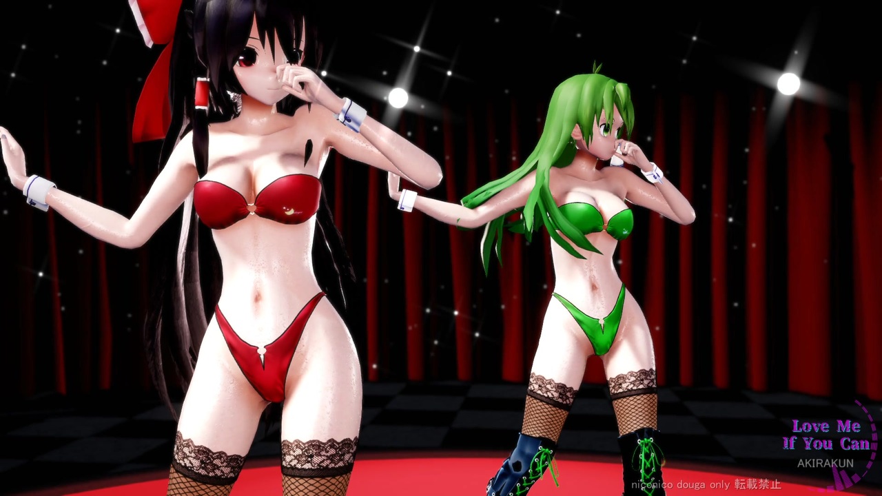 ふたりの巫女様に踊ってもらいました。<br>現在、作成リクエストは受け付けていません。<br><br><br>【楽曲】:「Love Me If You Can」:梅とら様 <a href="https://www.nicovideo.jp/watch/sm25892554" class="watch">sm25892554</a><br>【振付】:ATY様 <a href="https://www.nicovideo.jp/watch/sm27980070" class="watch">sm27980070</a><br>【モーション】:さだなか様 <a href="https://www.nicovideo.jp/watch/sm30401854" class="watch">sm30401854</a><br>【カメラ】:AKIRAKUN 作ってみました<br><br><br>■ステージ<br>szk_stage11:鈴木.zip 様 <a href="https://seiga.nicovideo.jp/seiga/im11205075" target="_blank" rel="noopener">im11205075</a><br><br>■モデル<br>博麗霊夢:にがもん様、しえら様<br>東風谷早苗:kaoru様 <a href="https://www.nicovideo.jp/watch/sm25016015" class="watch">sm25016015</a><br> 幻想幽玄庵:<a href="http://gensoukyou.1000.tv/" target="_blank" rel="noopener nofollow">http://gensoukyou.1000.tv/</a><br>衣装:アールビット様<br><br>■エフェクト<br>Ray-mmd-1.5.2:Rui様<br>初心者マテリアル:さらしな様<br>肌マテリアル:MARUSU様<br>AutoLuminous4:そぼろ様<br>水面エフェクト:ビームマンP様<br>空中に漂う埃:化身バレッタ様<br>ikBokeh_v018c:ikeno様<br><br><br>MikuMikuDance:樋口優様<br>MMEffect :舞力介入P様<br>PMDE、PmxE:極北P様<br>AviUtl :KENくん様<br>・Aviutl + x264guiExでエンコード:rigaya様<br>Ut Video Codec Suite:ゆーむP様<br>上海アリス幻楽団・東方project(ZUN様)<br><br>ゆうろえーす様x9、グリモア人形様、Gutsないぜ様x2、cz500c様x2、Ziteng様、アルマク 鮎様x7、runmania様、黒兄貴様x2、ねむ様、ゆうろえーす様x4、またまたの広告ありがとうございます。(_ _ )<br>ゆうろえーす様、アルマク 鮎様、多大な広告@@・・・・・ありがとうございます。(_ _ )<br><br>mylist ② <a href="https://www.nicovideo.jp/mylist/72970530" target="_blank" rel="noopener">mylist/72970530</a> ① <a href="https://www.nicovideo.jp/mylist/63690967" target="_blank" rel="noopener">mylist/63690967</a> 旧 <a href="https://www.nicovideo.jp/mylist/61238351" target="_blank" rel="noopener">mylist/61238351</a><br><br> ※動画の転載は禁止です。<br>Attention,Unauthorized reproduction prohibited!!