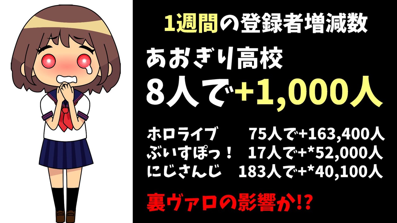 2023年6月4日、P2y.jpが出したVTuberグループごとの1週間のチャンネル登録者増加数をまとめた表が話題になっています。この動画ではそのデータを元に、あおぎり高校とにじさんじを中心にホロライブやぶいすぽっ!と絡めて語っていきます。<br><br>引用<br>VTuber YouTubeチャンネル登録者数情報 事務所・グループ別平均 2023年6月4日現在<br><a href="https://p2y.jp/vtuber-youtube-subscribers-information-agencies-and-groups-4-june-2023/" target="_blank" rel="noopener nofollow">https://p2y.jp/vtuber-youtube-subscribers-information-agencies-and-groups-4-june-2023/</a><br><br>Youtube <a href="https://www.youtube.com/@V_Virgin_Mary" target="_blank" rel="noopener nofollow">https://www.youtube.com/@V_Virgin_Mary</a><br>twitter <a href="https://twitter.com/V_Virgin_Mary" target="_blank" rel="noopener nofollow">https://twitter.com/V_Virgin_Mary</a><br><br>使用素材<br>高品質なフリー動画素材 - Pixabay <a href="https://pixabay.com/ja/videos" target="_blank" rel="noopener nofollow">https://pixabay.com/ja/videos</a>