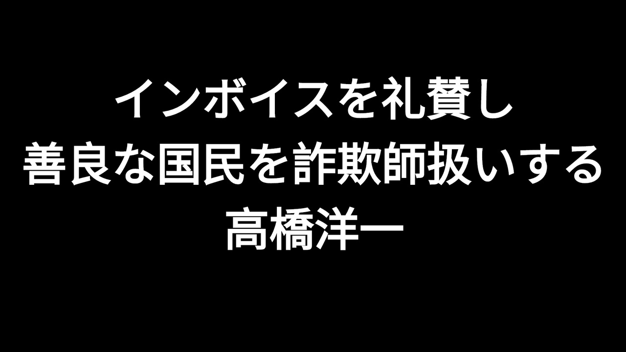 この投稿は3月26日、YouTubeにアップしたものです。<br><a href="https://youtu.be/Zi7UKSZ8DwM" target="_blank" rel="noopener nofollow">https://youtu.be/Zi7UKSZ8DwM</a><br>高橋洋一チャンネル 岸田首相の経済対策&インボイスに反対する人たち<br><a href="https://www.youtube.com/watch?v=emgBFyiujJ8&ab_channel=%E9%AB%99%E6%A9%8B%E6%B4%8B%E4%B8%80%E3%83%81%E3%83%A3%E3%83%B3%E3%83%8D%E3%83%AB" target="_blank" rel="noopener nofollow">https://www.youtube.com/watch?v=emgBFyiujJ8&ab_channel=%E9%AB%99%E6%A9%8B%E6%B4%8B%E4%B8%80%E3%83%81%E3%83%A3%E3%83%B3%E3%83%8D%E3%83%AB</a><br>インボイス導入根拠がついに論理破綻! 「消費税は預かり金ではない」と政府が国会で認めた決定的答弁の詳細<br><a href="https://article.auone.jp/detail/1/2/4/339_4_r_20230228_1677571258333004" target="_blank" rel="noopener nofollow">https://article.auone.jp/detail/1/2/4/339_4_r_20230228_1677571258333004</a><br>インボイス制度の本質は「増税」です<br><a href="https://yabuuchi-cpta.com/archives/4242" target="_blank" rel="noopener nofollow">https://yabuuchi-cpta.com/archives/4242</a><br>インボイス大反対:高橋洋一氏が語る『超左巻き』とは?<br><a href="https://www.tanukazoku.net/https:/www.tanukazoku.net/61043/" target="_blank" rel="noopener nofollow">https://www.tanukazoku.net/https:/www.tanukazoku.net/61043/</a><br>1億5千万円、維新→高橋洋一氏の政策工房<br><a href="https://minor-news.hateblo.jp/entry/takahashishi-seisakukoubou-ishin-150000000-yen" target="_blank" rel="noopener nofollow">https://minor-news.hateblo.jp/entry/takahashishi-seisakukoubou-ishin-150000000-yen</a><br>元々零細業者には免除されてた消費税を、たとえ赤字でも払わせることになる、残忍なインボイス制。<br><a href="https://naniwakawaraban.jp/2023/03/18/%e5%85%83%e3%80%85%e9%9b%b6%e7%b4%b0%e6%a5%ad%e8%80%85%e3%81%ab%e3%81%af%e5%85%8d%e9%99%a4%e3%81%95%e3%82%8c%e3%81%a6%e3%81%9f%e6%b6%88%e8%b2%bb%e7%a8%8e%e3%82%92%e3%80%81%e3%81%9f%e3%81%a8%e3%81%88/" target="_blank" rel="noopener nofollow">https://naniwakawaraban.jp/2023/03/18/%e5%85%83%e3%80%85%e9%9b%b6%e7%b4%b0%e6%a5%ad%e8%80%85%e3%81%ab%e3%81%af%e5%85%8d%e9%99%a4%e3%81%95%e3%82%8c%e3%81%a6%e3%81%9f%e6%b6%88%e8%b2%bb%e7%a8%8e%e3%82%92%e3%80%81%e3%81%9f%e3%81%a8%e3%81%88/</a>