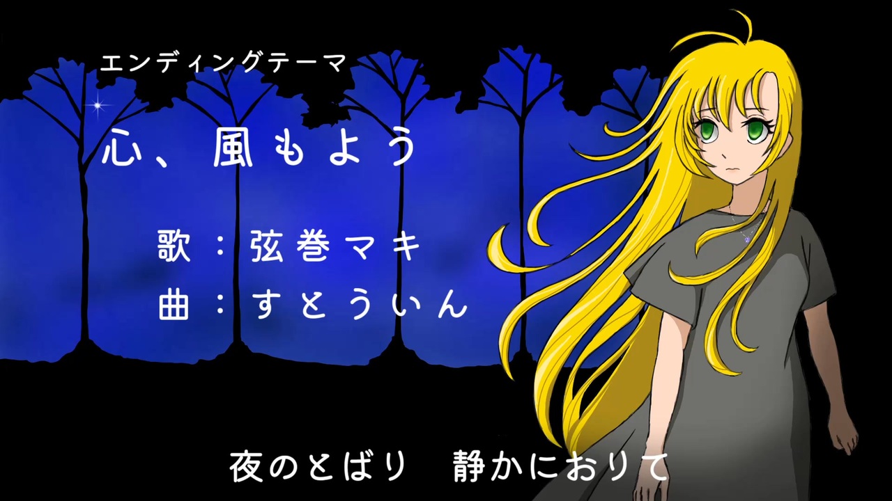 架空アニソン祭2023 参加作品です。<br><br>架空'80年代風ロボットアニメ 「超次元機神ジンライ」<br>エンディングテーマ<br> 心、風もよう<br>歌:弦巻マキ (Synthesizer V AI)<br>作詞作曲 すとういん<br>イラスト とり<br><br>※歌詞(TVサイズ)<br>夜の帳、静かに降りて 一人で歩く、帰り道<br>夜空に見つけた一番星が わたしの想いでにじむ<br>もう会えないとわかってるのに まだこんなに寂しいの<br><br>あなたが去ったこの街の中にも 穏やかな風が吹きはじめたけど<br>愛をなくした私の胸の中は まだ切ない風の音鳴っている<br>わたしの心の模様は 明日も乾いた風ね<br><br>※曲のイメージ<br>ヒロイン「花嶺真実」が慕っていた先輩「風神隼人」が敵との戦闘で行方不明になった後、地球防衛連合に入隊するまでの地球にいるときの心情を歌った曲です。<br><br>※イントロダクション<br>(文字数制限のため省略しています。完全版はpiaproに掲載しています。<a href="https://piapro.jp/t/kBJp" target="_blank" rel="noopener nofollow">https://piapro.jp/t/kBJp</a> )<br>西暦2303年、文明消去機械生命体ゾーミンが太陽系にもいずれあらわれることを知らせる、銀河系から250万光年以上離れた惑星ゾラからの超次元メッセージを受け取る。<br>ゾラからのメッセージを受け取った地球は、地球防衛連合[E.D.A]宇宙軍を結成。<br>E.D.Aは2年後に現われたゾーミン機械兵器軍団を迎え撃つが、物量の戦力差により疲弊していき、ついには20歳から18歳の若者にもE.D.Aへの招集がかけられる。<br><br>18歳で招集に応じた「風神隼人」は宇宙戦闘機「センクウ改」のパイロットになるが、巨大機械兵器の攻撃により超次元ゲートから銀河系外に飛ばされて行方不明となる。運よくゾラ近傍に飛ばされたため、瀕死のところを救助され、一命をとりとめていた。<br><br>隼人の2年後輩で隼人に憧れを抱いていた、「花嶺真実」も18歳になり、行方不明になった隼人を見つけることができるかもしれないという一途の望みをかけ、E.D.Aに入隊する。<br>ゾーミンに対抗するため密かに開発されていた人型スーパーロボである超神機ジンライの操縦の能力適正に完全に合致した真実がパイロットに選ばれる。真実は隼人との再会を果たすため、地球を守るため、超神機ジンライで出撃する。<br><br>一方、ゾラでは滅亡寸前のところ超神機ゼイナスが完成する。ゾラを守るためパイロットになることを決意した隼人はゼイナスで出撃する。<br><br>真実と隼人はゾーミン機械兵器軍団との熾烈な戦いに打ち勝ち、地球とゾラを守り切り、次元の壁を越え再会できるのか!<br><br><br><br><br><br><br>