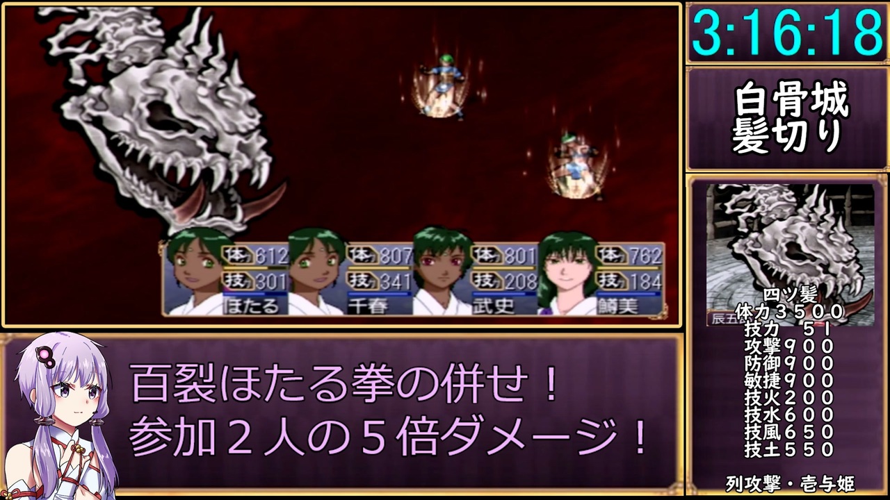 道半ばでチャート崩壊ぎみ<br>---<br>今回の動画内容<br>(槍拳チャート)<br>子の戦勝点稼ぎ<br>親王鎮魂墓攻略<br>白骨城攻略<br>---<br><br>計測開始<br>難易度設定後の「これでよし」<br>計測終了<br>裏ボス撃破後の「敵を一掃!!完全勝利!!」の表示<br><br><a href="https://www.nicovideo.jp/watch/sm42326520" class="watch">sm42326520</a>←前|次→<a href="https://www.nicovideo.jp/watch/sm42360753" class="watch">sm42360753</a>(16日20時公開予定)<br>シリーズ:<a href="https://www.nicovideo.jp/series/411544" target="_blank" rel="noopener">series/411544</a>