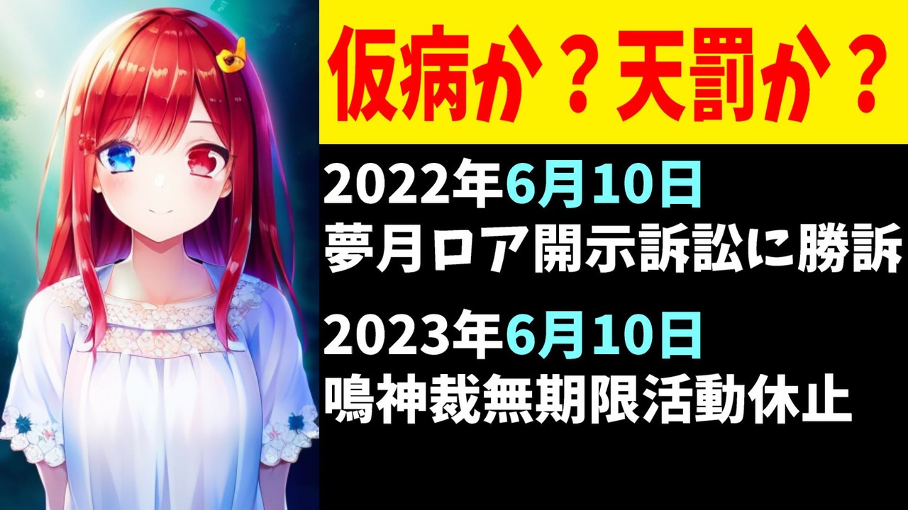 2023年6月10日、ちょうど去年の同じ日に、にじさんじに夢月ロアさんに開示された迷惑系バーチャルツイキャスターの鳴神裁が無期限活動休止を発表しました。<br><br>引用<br><a href="https://twitter.com/narukami_sabaki/status/1667437498350600192" target="_blank" rel="noopener nofollow">https://twitter.com/narukami_sabaki/status/1667437498350600192</a><br><br>Youtube <a href="https://www.youtube.com/@V_Virgin_Mary" target="_blank" rel="noopener nofollow">https://www.youtube.com/@V_Virgin_Mary</a><br>twitter <a href="https://twitter.com/V_Virgin_Mary" target="_blank" rel="noopener nofollow">https://twitter.com/V_Virgin_Mary</a><br><br>使用素材<br>高品質なフリー動画素材 - Pixabay <a href="https://pixabay.com/ja/videos" target="_blank" rel="noopener nofollow">https://pixabay.com/ja/videos</a>