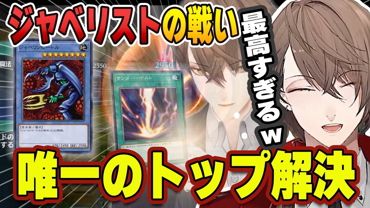 千年原人に続きジャベリンビートル縛りによるジャベリスト同士の闘い。<br>葉加瀬冬雪に引き続きサンダーボルトをデスティニー・ドロー。<br><br>▽葉加瀬冬雪の場合<br>絶望的な状況で指示厨の心が1つにまとまった「サンダーボルトを引いて」からの大逆転で熱くなる葉加瀬冬雪<br><a href="https://youtu.be/CtqDYylA7HA" target="_blank" rel="noopener nofollow">https://youtu.be/CtqDYylA7HA</a><br><br><a href="#" class="seekTime" data-seekTime="1:34" onclick="seekNicoPlayer('#1:34'); return false;">#1:34</a> 使用デッキのジャベルドーザーについて<br><a href="#" class="seekTime" data-seekTime="4:09" onclick="seekNicoPlayer('#4:09'); return false;">#4:09</a> デュエル<br><a href="#" class="seekTime" data-seekTime="8:40" onclick="seekNicoPlayer('#8:40'); return false;">#8:40</a> デスティニー・ドロー(サンダーボルト)<br><a href="#" class="seekTime" data-seekTime="12:00" onclick="seekNicoPlayer('#12:00'); return false;">#12:00</a> 神トップが続く<br><br><br>▼元動画↓<br>【遊戯王 マスターデュエル】ジャベリンビートルをフィールドに出さないと勝ってはいけない決闘部屋【にじさんじ/加賀美ハヤト】<br><a href="https://www.youtube.com/watch?v=RK_cr9KT7EQ" target="_blank" rel="noopener nofollow">https://www.youtube.com/watch?v=RK_cr9KT7EQ</a><br><br>▼登場ライバー<br>加賀美 ハヤト/Hayato Kagami <br><a href="https://www.youtube.com/channel/UCmovZ2th3Sqpd00F5RdeigQ" target="_blank" rel="noopener nofollow">https://www.youtube.com/channel/UCmovZ2th3Sqpd00F5RdeigQ</a><br><br><br>▽関連動画<br>公式オリカと呼ばれるくらいチート効果を持つ禁止カードに驚く天狗+元凶アナコンダを語る教授<br><a href="https://www.nicovideo.jp/watch/sm42260575" target="_blank" rel="noopener nofollow">https://www.nicovideo.jp/watch/sm42260575</a><br><br>【最強サイクロン】初心者あるあるを丁寧に解説する教授とやらかしたライバー達まとめ <br><a href="https://www.nicovideo.jp/watch/sm41374669" target="_blank" rel="noopener nofollow">https://www.nicovideo.jp/watch/sm41374669</a><br><br><br>
