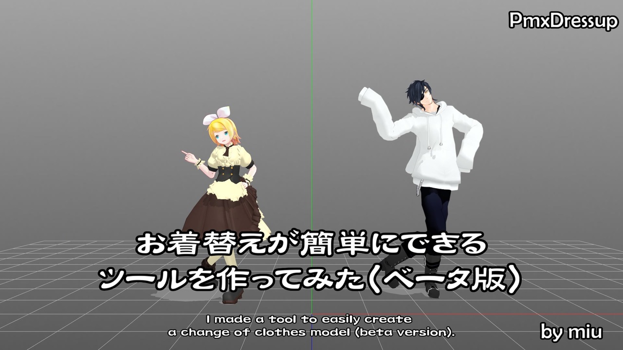 <span style="font-size: 18px;"><strong>「PmxDressup」正式版配布開始しました → <a href="https://www.nicovideo.jp/watch/sm42645182" class="watch">sm42645182</a></strong></span><br><br>---------------------------------<br><br>お着替えツール「PmxDressup」 <strong>ベータ版 </strong>の配布開始します!<br><br>■概要<br>指定したモデルに指定した衣装を体形に合わせてフィッティングするツール<br>自動である程度フィッティングした上で、個別ボーンに対して調整できます<br><br>■注意事項<br>・あくまでベータ版なので出来はまだ荒いです<br>・変形を綺麗にするため、衣装モデルのウェイトを若干弄ってます<br> ウェイト操作が許可されていない衣装モデルにはご利用いただけません<br><br>---------------------------------<br><br>■配布元URL<br><a href="https://bowlroll.net/file/301915" target="_blank" rel="noopener nofollow">https://bowlroll.net/file/301915</a><br>※DLキーはニコニコミュニティにて公開しています<br><br>■コンテンツツリー登録用静画<br><a href="https://seiga.nicovideo.jp/seiga/im11209493" target="_blank" rel="noopener">im11209493</a><br><br>■最終アップデート<br>2023/07/12 1.0.0_β41<br />---------------------------------<br><br>Vmd(モーション)関連ツール: <a href="https://www.nicovideo.jp/series/87033" target="_blank" rel="noopener">series/87033</a><br>Pmx(モデル)関連ツール: <a href="https://www.nicovideo.jp/series/280612" target="_blank" rel="noopener">series/280612</a><br>miuの実験室出張版アーカイブ+α: <a href="https://www.nicovideo.jp/series/332318" target="_blank" rel="noopener">series/332318</a><br>MMD自動トレース挑戦の記録: <a href="https://www.nicovideo.jp/series/87034" target="_blank" rel="noopener">series/87034</a><br>MMD配布物・Tips等: <a href="https://www.nicovideo.jp/series/244805" target="_blank" rel="noopener">series/244805</a><br>自作MMD作品マイリスト: <a href="https://www.nicovideo.jp/mylist/47353166" target="_blank" rel="noopener">mylist/47353166</a><br><br>---------------------------------<br>■ ヘルプが必要な場合<br><br>ツールの不具合報告やご相談はコミュニティからお願いします<br>それ以外からのご連絡は、お答えしかねます<br><br>---------------------------------<br>■ コミュニティのご案内<br><br><strong>MMD長屋</strong>:<a href="https://discord.gg/jDqU6qRaKj" target="_blank" rel="noopener nofollow">https://discord.gg/jDqU6qRaKj</a><br><br> カテゴリごとにオーナーがいて、希望するカテゴリに参加できる形式のちょっと変わったDiscordサーバーです<br> ニコニコミュニティなどでのコミュ限配布や交流などの使い方を想定しています<br> カテゴリ開設を申請していただくことも可能です<br><br>----------------<br><br><strong>miuの実験室</strong>:<a href="https://discord.gg/MW2Bn47aCN" target="_blank" rel="noopener nofollow">https://discord.gg/MW2Bn47aCN</a><br><br> VMDサイジングやモーションサポーターなど、自作ツールに関する諸々実験室<br> 拙作ツールに関する質問や相談を受け付けています。FAQページも用意しています。<br> また一足早くベータ版を試していただくことができます。<br> 「MMD長屋」サーバーの1カテゴリなので、サーバーに参加してから参加希望を申請してください<br><br>---------------------------------<br><br>よければコーヒーの一杯でも奢ってくださいw<br><a href="https://giftee.com/u/miu200521358" target="_blank" rel="noopener nofollow">https://giftee.com/u/miu200521358</a>