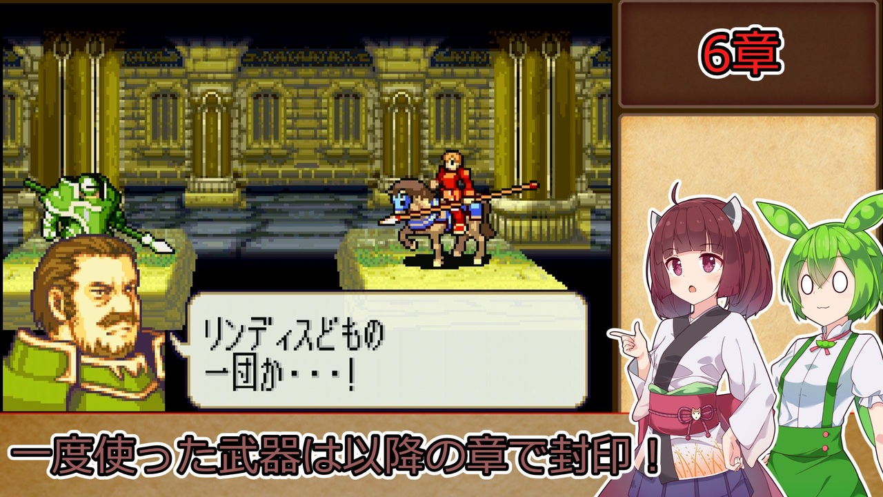 <span style="color: #85200c; font-size: 18px;"><strong><i>何か立ち絵の編集方法が全く最適化されてないらしく<br>ちゃんと設定すれば3倍くらい早く動画作れそうなんですよね</i></strong></span><br><span style="color: #6aa84f; font-size: 18px;"><strong><i>えぇ…</i></strong></span><br><br><strong>ルール1:一度使用した武器種は、以降の章で使用する事を禁止する。<br>ルール2:武器の使用の定義は『その武器を装備した状態で敵との戦闘が発生したタイミング』『その武器を売却して換金した場合』杖の場合は『対象に対して使用した時点(命中の可否は問わない)』とする。</strong><br><span style="color: #ff0000;"><strong>※同盟軍、演出による戦闘イベントでは使用した判定にはならないこととする。</strong></span><br><strong>ルール3:難易度はリン編ハード→ヘクトル編ハードとする。<br>ルール4:序章から終章まで外伝、異伝を含む全ての章を攻略し、仲間に出来るユニットは全員加入させ、生存させる。(序章と1章のみ同一の章として扱う)</strong><br><span style="color: #ff0000; font-size: 18px;"><strong>※バグ技禁止</strong></span><br><br>本動画のシリーズリスト【<a href="https://www.nicovideo.jp/series/406473" target="_blank" rel="noopener">series/406473</a>】<br>前作の同縛りプレイ【<a href="https://www.nicovideo.jp/series/316824" target="_blank" rel="noopener">series/316824</a>】<br>前:【<a href="https://www.nicovideo.jp/watch/sm42277759" class="watch">sm42277759</a>】次:【<a href="https://www.nicovideo.jp/watch/sm42371909" class="watch">sm42371909</a>】<br><br><strong>使用したソフト</strong><br>VOICEROID+東北きりたんEX<br>VOICEPEAK 東北きりたん<br>VOICEPEAK ずんだもん<br><strong>お借りした素材</strong><br>ニコニコモンズの皆様(コンテンツツリー参照)