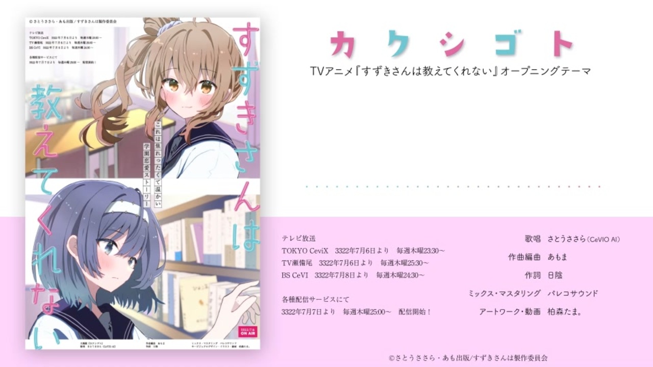ごきげんよう♬ あもまです。<br><br>先週のエンディングに続き、オープニングのフルバージョンです!<br>あわせてよろしくお願いいたしますー!<br><br><br><br><strong>『カクシゴト』 / さとうささら</strong><br><br>歌唱:さとうささら (CeVIO AI)<br>作曲・編曲:あもま (@Ax_Moma)<br>作詞:日陰 (@hikage_create)<br>ミックス・マスタリング:パレコサウンド (@PaletteRecord)<br>アートワーク・動画:柏森たま。 (@tama0104)<br><br>TVサイズバージョン→<a href="https://www.nicovideo.jp/watch/sm42307864" class="watch">sm42307864</a><br><br>インスト・歌詞↓<br><a href="https://drive.google.com/drive/u/1/folders/1wR0HD39SYdMaahpu6afZYw6J1XfU94ay" target="_blank" rel="noopener nofollow">https://drive.google.com/drive/u/1/folders/1wR0HD39SYdMaahpu6afZYw6J1XfU94ay</a><br /><br>Twitter:<a href="https://twitter.com/ax_moma" target="_blank" rel="noopener nofollow">https://twitter.com/ax_moma</a>