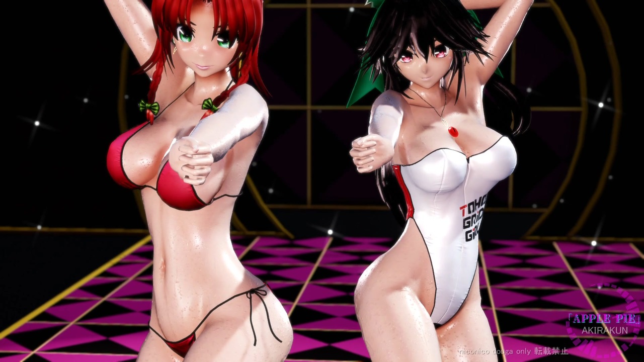 2人に踊ってもらいました。<br>美鈴は、3.0物理モデル(しり、太もも物理)。お空は、なし。確かに動きが違います@@。<br>現在、作成リクエストは受け付けていません。<br><br><br>【ミュージック】:APPLE PIE/ FIESTAR<br><a href="https://www.youtube.com/watch?v=3BpnB47Fxts" target="_blank" rel="noopener nofollow">https://www.youtube.com/watch?v=3BpnB47Fxts</a><br><br>【モーション・カメラ】:Ademar440 様<br><a href="https://www.nicovideo.jp/user/10049938" target="_blank" rel="noopener nofollow">https://www.nicovideo.jp/user/10049938</a><br>※カメラは2人用に調整・一部改変しています。<br><br><br>■ステージ<br>szk_stage08:鈴木.zip 様 <a href="https://seiga.nicovideo.jp/seiga/im10952832" target="_blank" rel="noopener">im10952832</a><br><br>■モデル<br>紅美鈴、:アールビット様<br>霊烏路空:かなみ様、アールビット様<br>・衣装:アールビット様<br><br>■エフェクト<br>Ray-mmd-1.5.2:Rui様<br>初心者マテリアル:さらしな様<br>肌マテリアル:MARUSU様<br>Arlvit_dds_2K:アールビット様<br>AutoLuminous4:そぼろ様<br>水面エフェクト:ビームマンP様<br>空中に漂う埃:化身バレッタ様<br>ikBokeh_v018c:ikeno様<br><br><br>MikuMikuDance:樋口優様<br>MMEffect :舞力介入P様<br>PMDE、PmxE:極北P様<br>AviUtl :KENくん様<br>Ut Video Codec suite:ゆーむP様<br>上海アリス幻楽団・東方project(ZUN様)<br><br>烏龍茶様、しめじ様、アルマク 鮎様、まさちち様、runmania様、うぽぽ様x2、GOPAN様、ねむ様x2、SANDERS様、壮年JUMP様、広告ありがとうございます。(_ _)<br>アルマク 鮎様、烏龍茶様、多大な広告@@・・・ありがとうございます。(_ _)<br><br>mylist ② <a href="https://www.nicovideo.jp/mylist/72970530" target="_blank" rel="noopener">mylist/72970530</a> ① <a href="https://www.nicovideo.jp/mylist/63690967" target="_blank" rel="noopener">mylist/63690967</a> 旧 <a href="https://www.nicovideo.jp/mylist/61238351" target="_blank" rel="noopener">mylist/61238351</a><br><br> ※動画の転載は禁止です。<br>Attention,Unauthorized reproduction prohibited!!