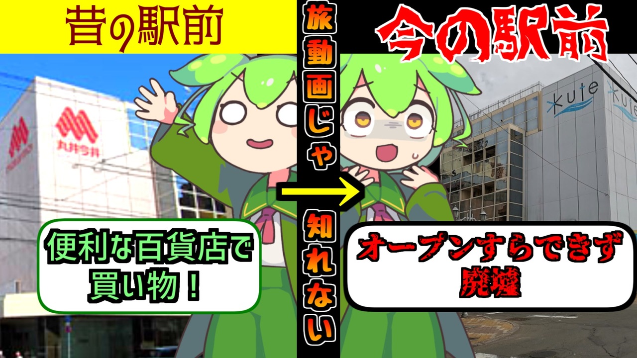釧路の駅前は廃墟・シャッターだらけです。<br><br>過去の釧路を知るものとしては、とても寂しい気分になります。<br><br>今回はそんな釧路駅前の今と昔の思い出を語ります。<br><br>引用:@HIRO_CR75101<br><br>●YouTube<br><a href="https://youtu.be/GP8PWrBLjq4" target="_blank" rel="noopener nofollow">https://youtu.be/GP8PWrBLjq4</a><br><br><br>●音声ソフト<br>VOICEVOX:ずんだもん<br>VOICEVOX:四国めたん<br><br>●Twitter:<a href="https://twitter.com/acerola_vitamin" target="_blank" rel="noopener nofollow">https://twitter.com/acerola_vitamin</a><br /><span style="color: #ff0000; font-size: 24px;"><strong>釧路を紹介するブログ始めました</strong></span>:<a href="https://946de2100.com" target="_blank" rel="noopener nofollow">https://946de2100.com</a><br><br><span style="color: #ff0000; font-size: 16px;"><strong>●おススメ動画:</strong></span><span style="color: #ff0000; font-size: 18px;"><strong>【歴史解説】かつて 釧路を支配していたのは佐賀だった ~釧路元町の始まりと佐野孫右衛門の盛衰~</strong></span><br><br><a href="https://www.nicovideo.jp/watch/sm44267722" class="watch">sm44267722</a><br><br><br><span style="color: #ff0000; font-size: 18px;"><strong>●YouTubeチャンネルも登録よろしくお願いします</strong></span><br><strong>釧路チャンネル <a href="https://www.youtube.com/@znd-kaisetu" target="_blank" rel="noopener nofollow">https://www.youtube.com/@znd-kaisetu</a></strong><br>恋結シラリカソロチャンネル <a href="https://www.youtube.com/@enmusubi-shirarika" target="_blank" rel="noopener nofollow">https://www.youtube.com/@enmusubi-shirarika</a><br><br><br>ほしいものリスト <a href="https://www.amazon.jp/hz/wishlist/ls/2OUUB1JQSRUWG?ref_=wl_share" target="_blank" rel="noopener nofollow">https://www.amazon.jp/hz/wishlist/ls/2OUUB1JQSRUWG?ref_=wl_share</a><br>クリエイターサポート<a href="https://creator-support.nicovideo.jp/registration/116665199" target="_blank" rel="noopener nofollow">https://creator-support.nicovideo.jp/registration/116665199</a>