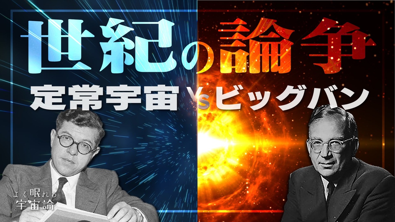 「命名者として特許を取得しておくべきだったよ」<br><br>宇宙の成り立ちを科学する「宇宙論」について<br>(元)天文学者が数式を用いずわかりやすく説明するシリーズです。<br><br>復習<br>ビッグバンの問題点と定常宇宙論:<a href="https://www.nicovideo.jp/watch/sm42186325" class="watch">sm42186325</a><br>「宇宙の最初の5分間」で起きたこと:<a href="https://www.nicovideo.jp/watch/sm42063667" class="watch">sm42063667</a><br>ざっくり分かる「相対性理論」:<a href="https://www.nicovideo.jp/watch/sm39080912" class="watch">sm39080912</a><br><br><a href="#" class="seekTime" data-seekTime="0:00" onclick="seekNicoPlayer('#0:00'); return false;">#0:00</a> はじめに<br><a href="#" class="seekTime" data-seekTime="2:33" onclick="seekNicoPlayer('#2:33'); return false;">#2:33</a> 2大モデルの評価<br><a href="#" class="seekTime" data-seekTime="7:48" onclick="seekNicoPlayer('#7:48'); return false;">#7:48</a> 喧伝と「ビッグバン」<br><a href="#" class="seekTime" data-seekTime="16:07" onclick="seekNicoPlayer('#16:07'); return false;">#16:07</a> 生き残るのはどちらか<br><a href="#" class="seekTime" data-seekTime="20:17" onclick="seekNicoPlayer('#20:17'); return false;">#20:17</a> おわりに<br><br><a href="https://www.nicovideo.jp/watch/sm42186325" class="watch">sm42186325</a>←前|次→まだ<br><br>Twitter : <a href="https://twitter.com/hayashi_lanturn" target="_blank" rel="noopener nofollow">https://twitter.com/hayashi_lanturn</a><br>ご感想・ご質問などはコメントかTwitterタグ #ハヤシングエルス まで。