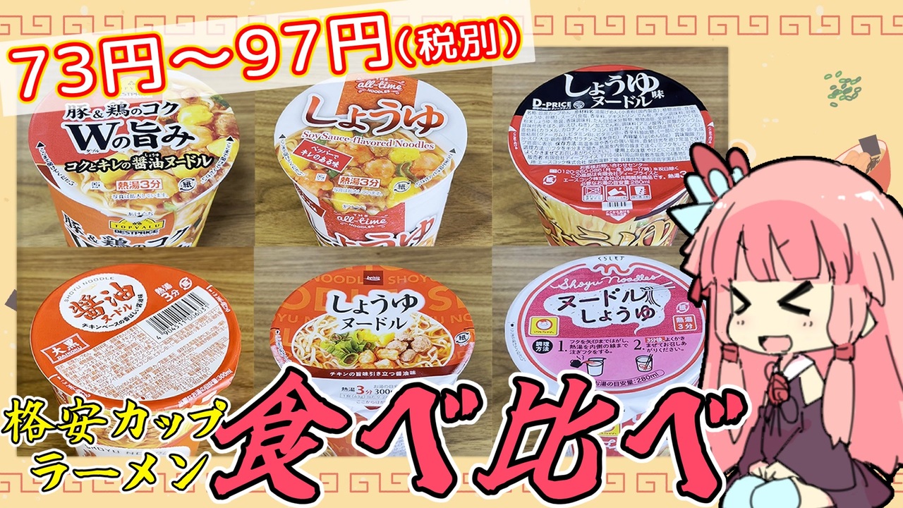 (6/19追記アリ)<br><br>カップラーメン、100円以下じゃないと買うのをためらってしまいがち。<br>そんな同志たちへ向けた、物価の上昇に抗った食べ比べ動画です。<br> <br>たまにはこういう動画作るのも楽しいな、ふへへ(°∀°*)<br><br>00:00 導入<br>01:30 トップバリュ ベストプライス(イオン)<br>04:21 THE all-time NOODLES(イオン)<br>06:00 D-PRICE(ラ・ムー)<br>07:18 大黒(業務スーパー)<br>08:25 ベイシア<br>10:05 くらしモア<br>11:48 結果発表<br><br><br>※※※6/19追記※※※<br><br>【悲報】TVBP「豚&鶏のコク~」が本体価格117円に<br><br>先日買い物に行ったところ、上記の値段になってました。<br>動画にしたところなのに!ヒドイ!( ;∀; )<br><br>というワケで、残念ながらTVBPは本動画の”格安”から外れてしまいました…。<br>しかも公式HPを見ると、本体価格128円との記載。<br>値上げの可能性もありますが、たまたまうちの近所だけ長いこと97円のセールをしてた可能性が高いカモ(´・ω・`)<br><br>…つまりは平和堂が最強ってことやな!ガハハ!!(°∀°`)<br><br><br>Twitter:<a href="https://twitter.com/morimocchannel" target="_blank" rel="noopener nofollow">https://twitter.com/morimocchannel</a>