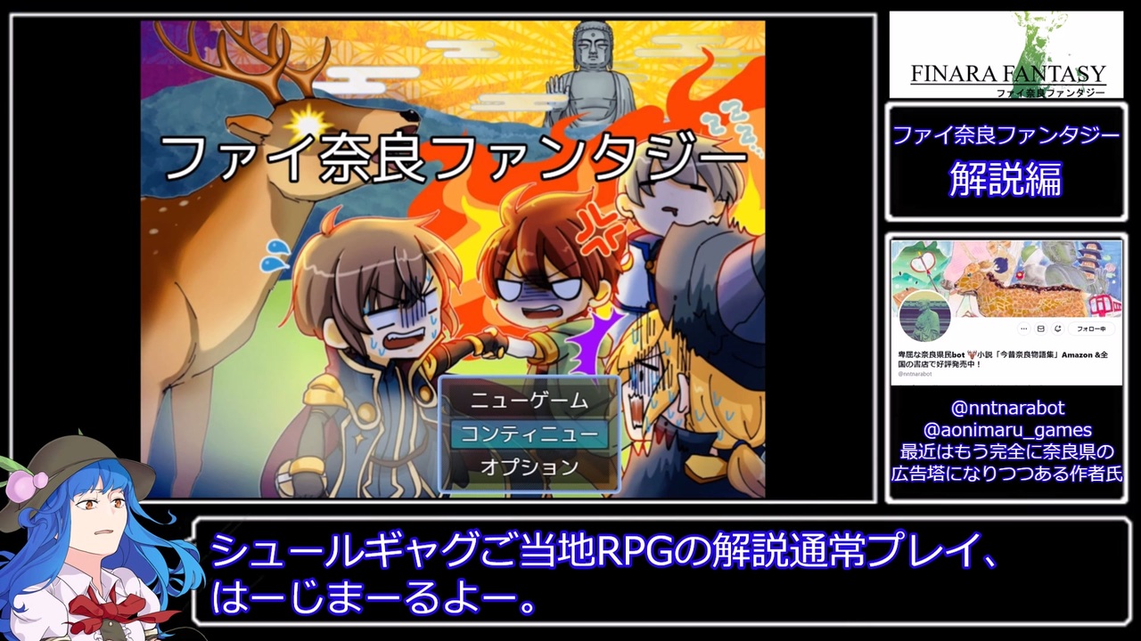 お久しぶりです。<br>今回は当該作品のRTAの前に解説通常プレイを行います。<br>第5弾はゲームアツマールからファイ奈良ファンタジーです。<br>アツマールは今月28日でサ終となるので、それまでに作りたかったものです。<br>当作品は奈良の作家、あをにまる氏(@aonimaru_games)が制作された、<br>奈良県の県内ネタを使用したご当地バカゲーとなっております。<br><a href="https://game.nicovideo.jp/atsumaru/games/gm18327" target="_blank" rel="noopener nofollow">https://game.nicovideo.jp/atsumaru/games/gm18327</a><br><br>本当はRTAからスタートしたかったのですが、とてもRTAで解説しきれないので、<br>いっそ通常プレイもやってしまえ、という事でまず出来たのがこちらになります。<br>サ終前に完結は間に合いませんが残り10日で収録は済ませる予定です。<br>作者様、クッソ汚い日本独自のインターネット文化を使用した解説でごめんなさい。<br><br>ゲーム開始~ワカクサの森まで<br>次→<a href="https://www.nicovideo.jp/watch/sm42527404" class="watch">sm42527404</a><br>RTA編→延期だ、すまねぇ…<br><br>ファイ奈良ファンタジーマイリス→<a href="https://www.nicovideo.jp/mylist/75336211" target="_blank" rel="noopener">mylist/75336211</a><br>RTA等の過去の制作動画Part1→<a href="https://www.nicovideo.jp/mylist/75335876" target="_blank" rel="noopener">mylist/75335876</a>