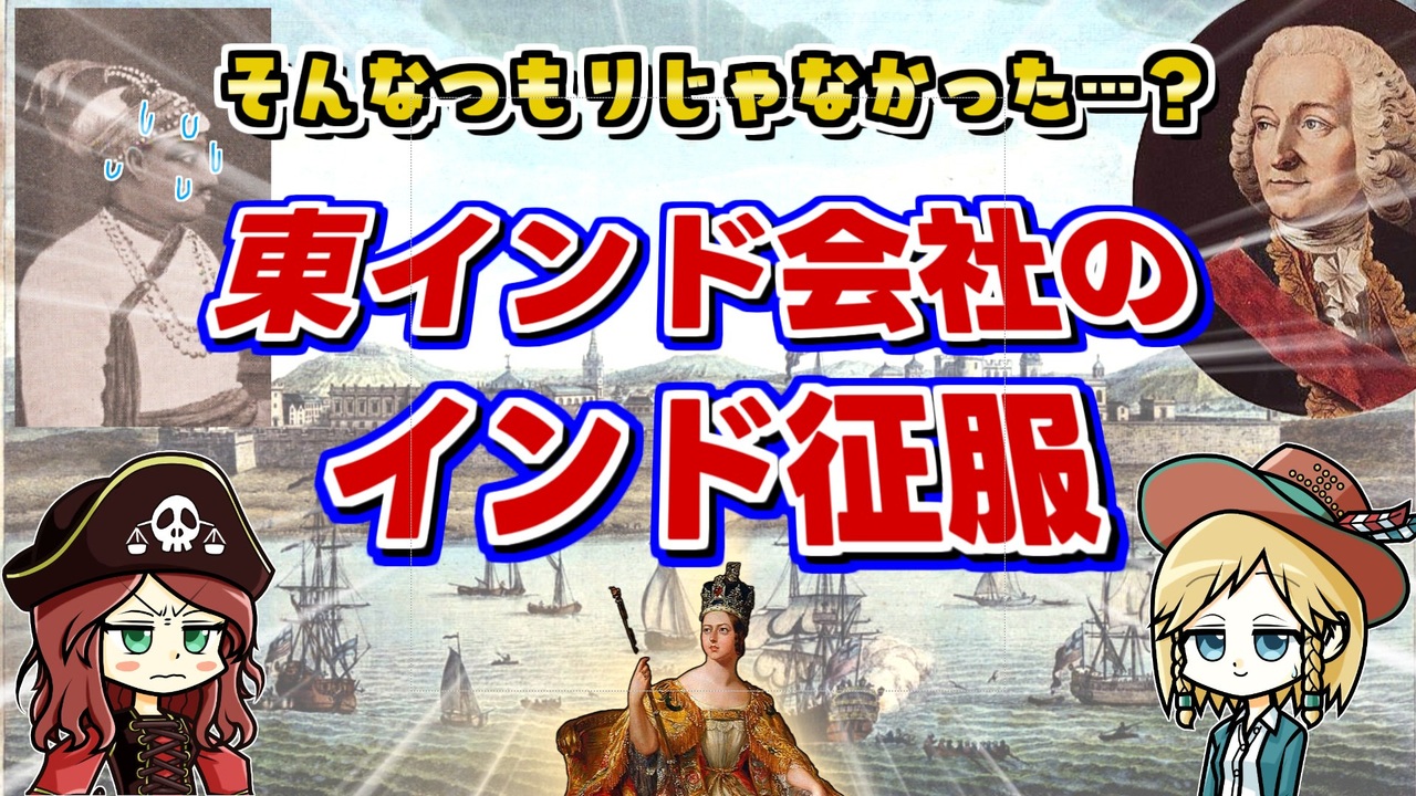 今やっている仕事が、子供の頃から思い描いていた未来なんて人は、まあ少数でしょう。<br>任天堂も、花札をつくっている頃にはコンピューターゲームで世界を制するなんて思わなかったんじゃないですかね。<br><br>東インド会社さんもそうです。まさかインドを丸ごと植民地にしちゃうなんてね。おかげでブリカスとか呼ばれる昨今です。<br><br>☆ファンアートありがとうございました☆<br>森野民さんのアカウント↓↓↓<br>Twitter → <a href="https://twitter.com/morino_otoha" target="_blank" rel="noopener nofollow">https://twitter.com/morino_otoha</a><br>pixiv → <a href="https://www.pixiv.net/users/9328328" target="_blank" rel="noopener nofollow">https://www.pixiv.net/users/9328328</a><br><br><br>今回の参考文献:<br>羽田正(2017)『興亡の世界史 東インド会社とアジアの海』講談社<br>ジェイソン・C・シャーマン(2021)『〈弱者〉の帝国』矢吹啓訳 中央公論新社<br>森村宗冬(2013)『大航海時代』新紀元社<br>小林章夫(2022)『イギリス貴族』講談社<br><br>その他 Wikipediaなど<br><br>twitter | <a href="https://twitter.com/Yukkuri_mond" target="_blank" rel="noopener nofollow">https://twitter.com/Yukkuri_mond</a><br />━━━━━━━━━━━━━━━━━━━━━<br><br>この動画はクリエイティブ・コモンズ継承(CC-BY-SA)ライセンスの素材を使用して制作しています。(<a href="https://creativecommons.org/licenses/by-sa/4.0/)" target="_blank" rel="noopener nofollow">https://creativecommons.org/licenses/by-sa/4.0/)</a><br>規約に基づき、この動画もCC-BY-SA 4.0 のもとで公開します。<br><br>投稿者共通情報☆彡<br><br>BGM, SE:ニコニ・コモンズ様<br><a href="http://commons.nicovideo.jp/" target="_blank" rel="noopener nofollow">http://commons.nicovideo.jp/</a><br>魔王魂様<br><a href="https://maoudamashii.jokersounds.com/" target="_blank" rel="noopener nofollow">https://maoudamashii.jokersounds.com/</a><br>Audiostock様<br><a href="https://audiostock.jp/" target="_blank" rel="noopener nofollow">https://audiostock.jp/</a><br><br>立ち絵 霊夢・魔理沙(黒子式):nicotalk様<br><a href="http://www.nicotalk.com/charasozai.html" target="_blank" rel="noopener nofollow">http://www.nicotalk.com/charasozai.html</a><br><br>立ち絵 パトラ、マリー、アン、メアリ:ライフライフ様<br><a href="https://0801lifelife.tumblr.com/" target="_blank" rel="noopener nofollow">https://0801lifelife.tumblr.com/</a><br><br>使用ツール1:ゆっくりムービーメーカー4<br><a href="https://manjubox.net/ymm4/" target="_blank" rel="noopener nofollow">https://manjubox.net/ymm4/</a><br><br>使用ツール2:AviUtl<br><a href="http://spring-fragrance.mints.ne.jp/aviutl/" target="_blank" rel="noopener nofollow">http://spring-fragrance.mints.ne.jp/aviutl/</a><br><br>各時代の地図 : World History Maps & Timelines <br><a href="http://geacron.com/home-en/" target="_blank" rel="noopener nofollow">http://geacron.com/home-en/</a><br><br>ゆっくりボイスについて:AquesTalkライセンス取得済み<br><br>キャラクターボイス<br>アン・ボニー:羽ノ華(A.I.VOICE)<br>メアリ・リード:琴葉 葵(A.I.VOICE)<br>クレオパトラ:結月ゆかり(VOICEROID2)<br>マリー‐アントワネット:東北きりたん (VOICEROID EX)<br>その他キャラ:青山龍星(A.I.VOICE)、伊織弓鶴(A.I.VOICE2)、栗田まろん(A.I.VOICE)、宮舞モカ(VOICEPEAK)、フリモメン(VOICEPEAK)<br><br><br><br>その他フリー素材ご提供元の皆様に圧倒的感謝<br>