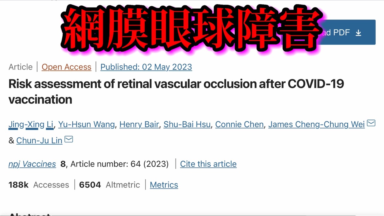 Risk assessment of retinal vascular occlusion after COVID-19 vaccination<br><a href="https://www.nature.com/articles/s41541-023-00661-7" target="_blank" rel="noopener nofollow">https://www.nature.com/articles/s41541-023-00661-7</a><br><br>‘My life is on hold’: Young tradie blinded after Moderna vaccine denied compensation<br><a href="https://www.news.com.au/lifestyle/health/health-problems/my-life-is-on-hold-young-tradie-blinded-after-moderna-vaccine-denied-compensation/news-story/ecefe023035617123c78aa4321e8fc9e" target="_blank" rel="noopener nofollow">https://www.news.com.au/lifestyle/health/health-problems/my-life-is-on-hold-young-tradie-blinded-after-moderna-vaccine-denied-compensation/news-story/ecefe023035617123c78aa4321e8fc9e</a><br><br><font color="red">クリエイターサポート</font><br><a href="https://creator-support.nicovideo.jp/registration/65066712?ref=pc_userpage" target="_blank" rel="noopener nofollow">https://creator-support.nicovideo.jp/registration/65066712?ref=pc_userpage</a>