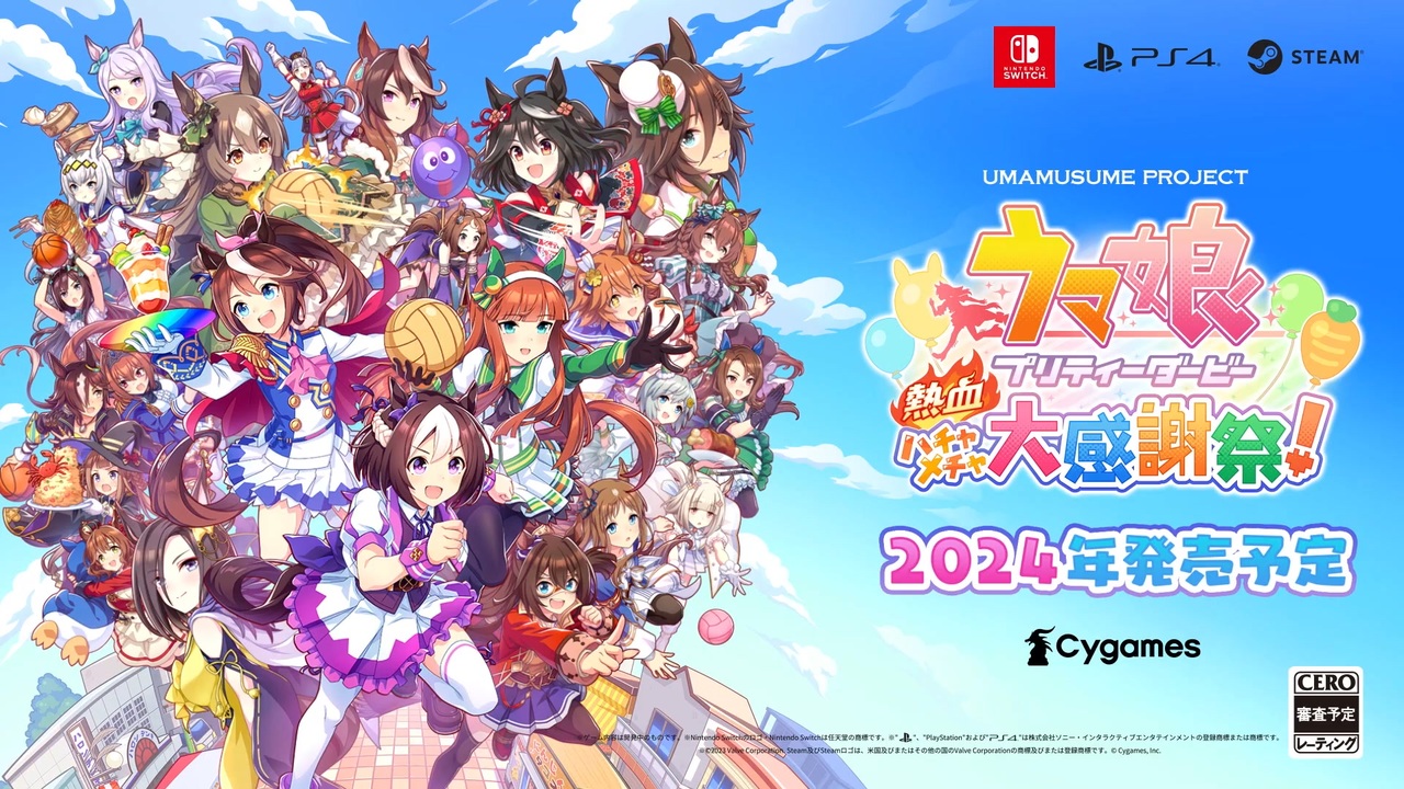 Nintendo Switch™/PlayStation®4/Steam®用ソフト『ウマ娘 プリティーダービー 熱血ハチャメチャ大感謝祭!』2024年発売決定!ティザーPV公開!<br><br>春のファン大感謝祭開幕!ドットで描かれたウマ娘たちによるハチャメチャカジュアルアクションゲームが登場! <br>ウマ娘たちがチームを組んで、特別イベント「ハチャメチャGP(グランプリ)」に挑む!挑戦するのは、どれもハチャメチャな種目ばかり!!<br>4つの種目を制し、優勝するのはどのチームだ!?<br><br>『ウマ娘 プリティーダービー 熱血ハチャメチャ大感謝祭!』公式サイト・公式ツイッターもオープンしました。<br>今後様々な情報が追加されますので、是非ご覧ください!<br><br>▼『ウマ娘 プリティーダービー 熱血ハチャメチャ大感謝祭!』公式サイト<br><a href="https://hachamecha-umamusume.jp/" target="_blank" rel="noopener nofollow">https://hachamecha-umamusume.jp/</a><br><br>▼『ウマ娘 プリティーダービー 熱血ハチャメチャ大感謝祭!』公式Twitter<br>@uma_musu_hacha<br><a href="https://twitter.com/uma_musu_hacha" target="_blank" rel="noopener nofollow">https://twitter.com/uma_musu_hacha</a><br><br>プラットフォーム:Nintendo Switch/PlayStation4/Steam<br>ジャンル:ハチャメチャカジュアルアクション<br>プレイ人数:1~4人(オンライン1~4人)<br>発売予定日:2024年<br>レーティング:審査予定