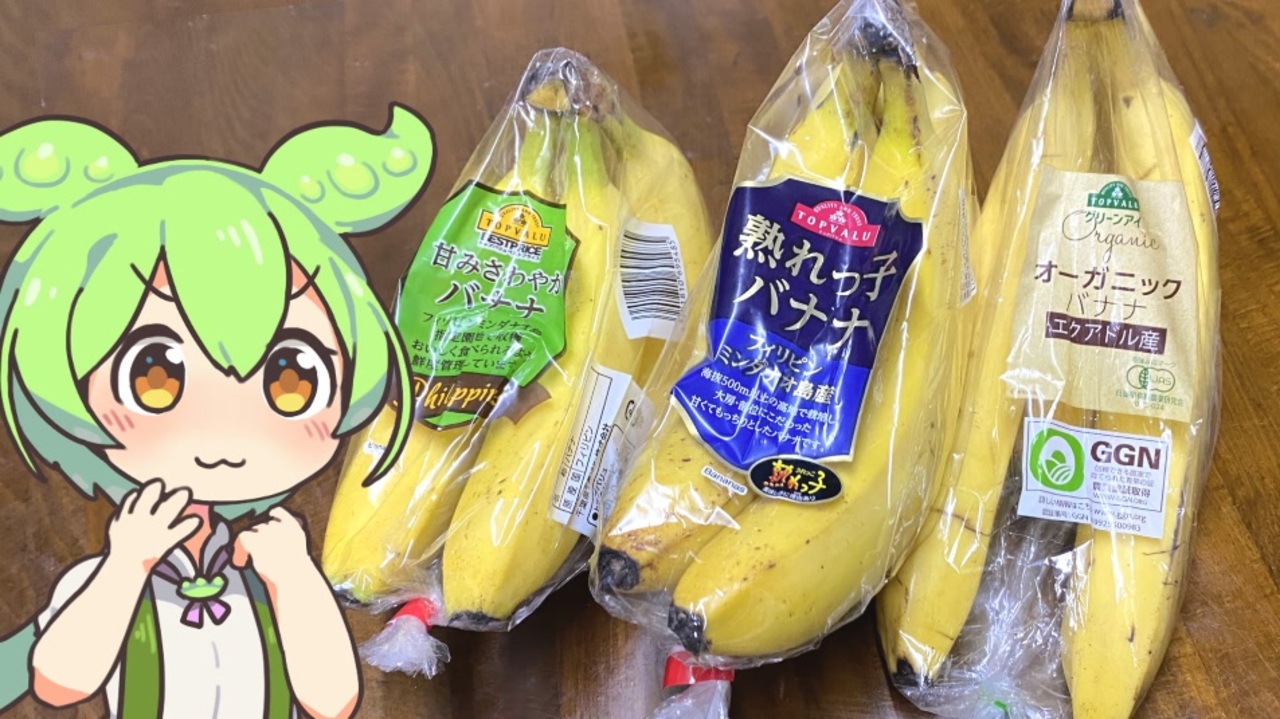 トプバナナです。<br><br><br>【参考】<br>赤トプバ:熟れっ子バナナ フィリピン ミンダナオ島産(トップバリュ)<br><a href="https://www.topvalu.net/items/detail/4549741003841/" target="_blank" rel="noopener nofollow">https://www.topvalu.net/items/detail/4549741003841/</a><br>緑トプバ:エクアドル産 オーガニック バナナ(トップバリュ)<br><a href="https://www.topvalu.net/items/detail/00162585/" target="_blank" rel="noopener nofollow">https://www.topvalu.net/items/detail/00162585/</a><br>「オーガニック」と「無農薬野菜」と「有機栽培」の違いは? 意味や農法を調べてみた(マイナビ農業)<br><a href="https://agri.mynavi.jp/2017_08_01_1054/" target="_blank" rel="noopener nofollow">https://agri.mynavi.jp/2017_08_01_1054/</a><br>有機野菜と無農薬野菜、オーガニック野菜の正しい見分け方まとめ(カゴメ)<br><a href="https://www.kagome.co.jp/vegeday/store/201702/6292/" target="_blank" rel="noopener nofollow">https://www.kagome.co.jp/vegeday/store/201702/6292/</a><br>有機JASマークがついた野菜は無農薬・無肥料で作られているのですか。(農林水産省)<br><a href="https://www.maff.go.jp/j/heya/sodan/1707/02.html" target="_blank" rel="noopener nofollow">https://www.maff.go.jp/j/heya/sodan/1707/02.html</a><br>バナナの国別輸入量を教えてください。また、インドはバナナの生産が多いと聞きますが輸入はないのですか。(農林水産省)<br><a href="https://www.maff.go.jp/j/heya/sodan/1201/01.html#:~:text=%E5%9B%9E%E7%AD%94,%E3%80%81%E7%B4%845%EF%BC%85%EF%BC%89%E3%81%A7%E3%81%99%E3%80%82" target="_blank" rel="noopener nofollow">https://www.maff.go.jp/j/heya/sodan/1201/01.html#:~:text=%E5%9B%9E%E7%AD%94,%E3%80%81%E7%B4%845%EF%BC%85%EF%BC%89%E3%81%A7%E3%81%99%E3%80%82</a><br>バナナの生産量が多い国(外務省)<br><a href="https://www.mofa.go.jp/mofaj/kids/ranking/banana.html" target="_blank" rel="noopener nofollow">https://www.mofa.go.jp/mofaj/kids/ranking/banana.html</a><br>輸入されたばかりのバナナは緑色だと聞きましたが、<br>なぜ黄色いバナナを輸入しないのですか。<br>また、植物検疫で害虫が見つかった場合に行われる消毒は<br>どのようなものですか。(農林水産省)<br><a href="https://www.maff.go.jp/j/heya/sodan/1705/01.html" target="_blank" rel="noopener nofollow">https://www.maff.go.jp/j/heya/sodan/1705/01.html</a><br><br><br>【使用した素材】(※敬称略)<br>(合成音声)VOICEVOX/ずんだもん/四国めたん<br><a href="https://voicevox.hiroshiba.jp/" target="_blank" rel="noopener nofollow">https://voicevox.hiroshiba.jp/</a><br>(立ち絵)坂本アヒル<br><a href="https://seiga.nicovideo.jp/seiga/im10788496" target="_blank" rel="noopener">im10788496</a>/<a href="https://seiga.nicovideo.jp/seiga/im10791276" target="_blank" rel="noopener">im10791276</a><br>(楽曲)甘茶の音楽工房/「楽しい麦畑」「フルーツパフェ」「お城の舞踏会」<br><a href="https://amachamusic.chagasi.com/" target="_blank" rel="noopener nofollow">https://amachamusic.chagasi.com/</a><br><br>