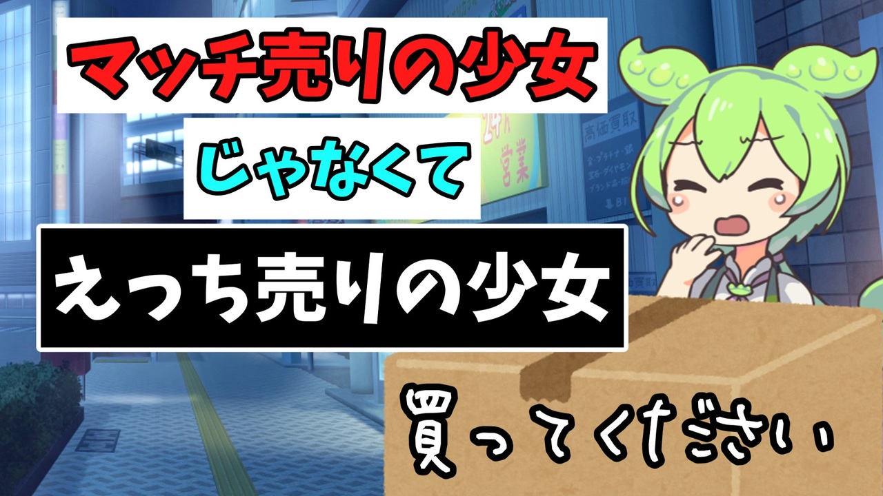 ずんだもんがえっちを売るようです。<br><br>最初の注意書きがすべてです。すみませんなんでもします。<br><br>下記の動画も参考までに<br><br>全く伸びなかった元動画<br><a href="https://youtu.be/-83yabb-8SM" target="_blank" rel="noopener nofollow">https://youtu.be/-83yabb-8SM</a><br><br>言葉の誤用警察<br><a href="https://youtu.be/9wxeZwzoeYI" target="_blank" rel="noopener nofollow">https://youtu.be/9wxeZwzoeYI</a><br><br>言葉と文化と認識<br><a href="https://youtu.be/pdgAJItPzxg" target="_blank" rel="noopener nofollow">https://youtu.be/pdgAJItPzxg</a><br><br>ついったー<br><a href="https://twitter.com/doublelemon2022" target="_blank" rel="noopener nofollow">https://twitter.com/doublelemon2022</a><br><br>●使用画像<br><br>いらすとや<br><a href="https://www.irasutoya.com/" target="_blank" rel="noopener nofollow">https://www.irasutoya.com/</a><br><br>みんちりえ( <a href="https://min-chi.material.jp/" target="_blank" rel="noopener nofollow">https://min-chi.material.jp/</a> )<br><br>●使用音源<br><br>効果音ラボ<br><a href="https://soundeffect-lab.info/" target="_blank" rel="noopener nofollow">https://soundeffect-lab.info/</a><br><br>Musmus<br><a href="https://musmus.main.jp/" target="_blank" rel="noopener nofollow">https://musmus.main.jp/</a><br><br>Masuo<br><a href="https://dova-s.jp/bgm/play10277.html" target="_blank" rel="noopener nofollow">https://dova-s.jp/bgm/play10277.html</a><br><br>Fukagawa<br><a href="https://dova-s.jp/bgm/play15591.html" target="_blank" rel="noopener nofollow">https://dova-s.jp/bgm/play15591.html</a><br><br>●立ち絵<br><br>坂本アヒル神<br><a href="https://seiga.nicovideo.jp/user/illust/97452727" target="_blank" rel="noopener nofollow">https://seiga.nicovideo.jp/user/illust/97452727</a><br><br>●声<br><br>VOICEVOX:ずんだもん<br>VOICEVOX:春日部つむぎ<br>VOICEVOX:四国めたん<br><a href="https://voicevox.hiroshiba.jp/" target="_blank" rel="noopener nofollow">https://voicevox.hiroshiba.jp/</a><br><br>●使用フォント<br><br>けいふぉんと<br><a href="http://font.sumomo.ne.jp/font_1.html" target="_blank" rel="noopener nofollow">http://font.sumomo.ne.jp/font_1.html</a><br>