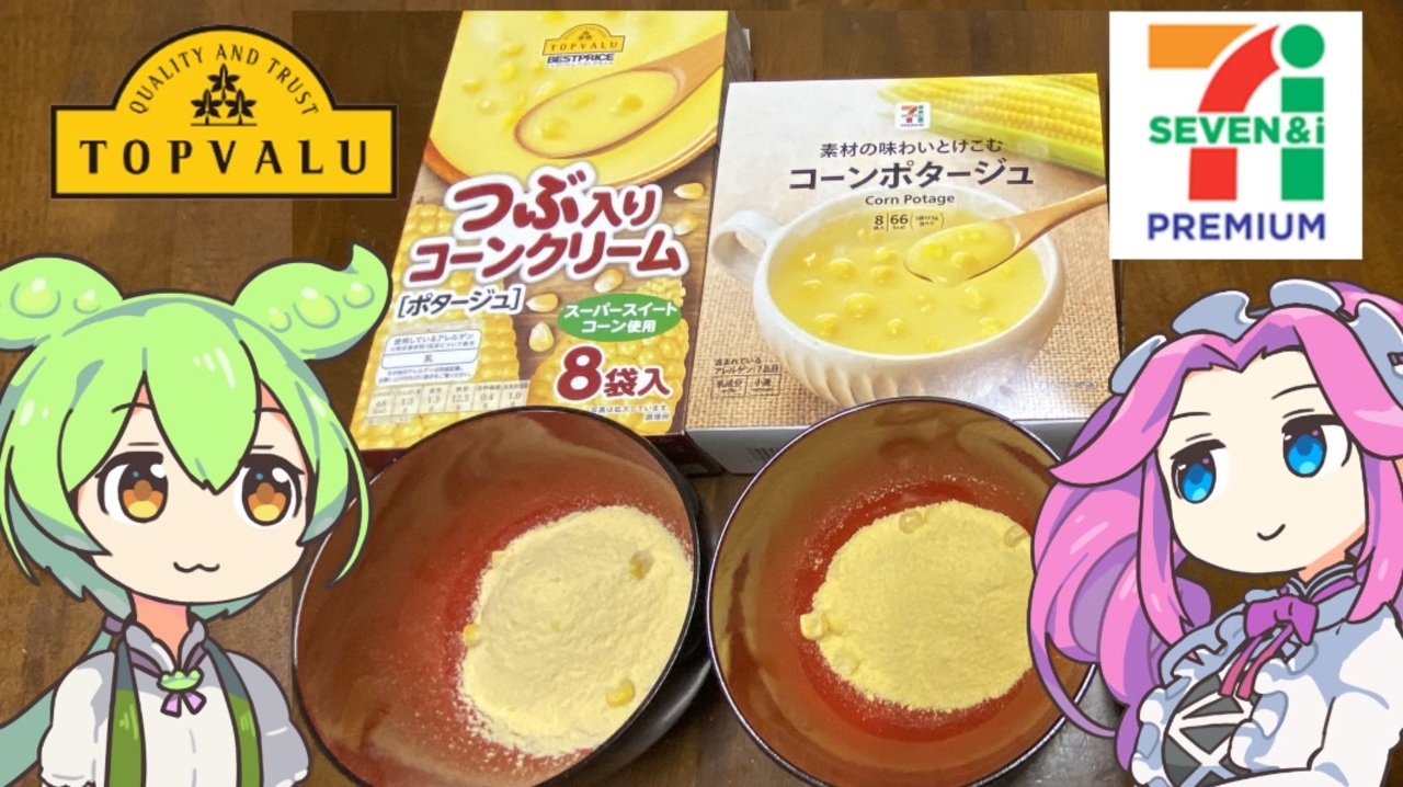 黄トプバ・セブンプレミアム・クノールのコーンスープを飲み比べます。<br><br><br>【参考】<br>つぶ入りコーンクリーム[ポタージュ](トップバリュ)<br><a href="https://www.topvalu.net/items/detail/4549414216042/" target="_blank" rel="noopener nofollow">https://www.topvalu.net/items/detail/4549414216042/</a><br>コーンポタージュ 8袋入(セブンプレミアム)<br><a href="https://7premium.jp/product/search/detail?id=4346" target="_blank" rel="noopener nofollow">https://7premium.jp/product/search/detail?id=4346</a><br>「クノール® カップスープ」(味の素)<br><a href="https://www.ajinomoto.co.jp/products/DetailCategory.aspx?Category=0105" target="_blank" rel="noopener nofollow">https://www.ajinomoto.co.jp/products/DetailCategory.aspx?Category=0105</a><br>ユナイテッドフーズインターナショナル<br><a href="https://ufi.co.jp/" target="_blank" rel="noopener nofollow">https://ufi.co.jp/</a><br>ベイクドモチョモチョ(ニコニコ大百科)<br><a href="https://dic.nicovideo.jp/a/%E3%83%99%E3%82%A4%E3%82%AF%E3%83%89%E3%83%A2%E3%83%81%E3%83%A7%E3%83%81%E3%83%A7" target="_blank" rel="noopener nofollow">https://dic.nicovideo.jp/a/%E3%83%99%E3%82%A4%E3%82%AF%E3%83%89%E3%83%A2%E3%83%81%E3%83%A7%E3%83%81%E3%83%A7</a><br><br><br>【使用した素材】(※敬称略)<br>(合成音声)VOICEVOX/ずんだもん/四国めたん<br><a href="https://voicevox.hiroshiba.jp/" target="_blank" rel="noopener nofollow">https://voicevox.hiroshiba.jp/</a><br>(立ち絵)坂本アヒル<br><a href="https://seiga.nicovideo.jp/seiga/im10788496" target="_blank" rel="noopener">im10788496</a>/<a href="https://seiga.nicovideo.jp/seiga/im10791276" target="_blank" rel="noopener">im10791276</a><br>(楽曲)甘茶の音楽工房/「楽しい麦畑」「フルーツパフェ」「お城の舞踏会」<br><a href="https://amachamusic.chagasi.com/" target="_blank" rel="noopener nofollow">https://amachamusic.chagasi.com/</a><br><br><br>【関連動画】<br>トップバリュの黄色いヤツ「今川焼あずきあん・カスタードクリーム」<br><a href="https://www.youtube.com/watch?v=vGxKLjQFaso&t=4s&ab_channel=maryu4492" target="_blank" rel="noopener nofollow">https://www.youtube.com/watch?v=vGxKLjQFaso&t=4s&ab_channel=maryu4492</a><br><br>