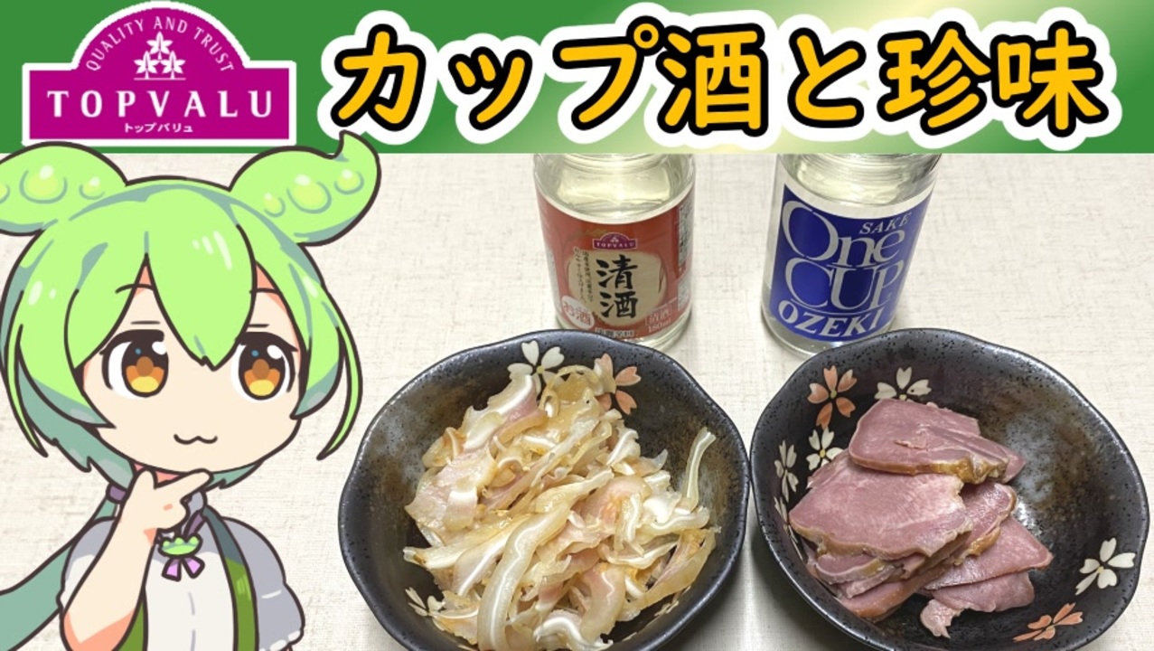 トップバリュのカップ酒と珍味です。<br><br><br>【参考】<br>清酒(トップバリュ)<br><a href="https://www.topvalu.net/items/detail/4901810334605/" target="_blank" rel="noopener nofollow">https://www.topvalu.net/items/detail/4901810334605/</a><br>ミミガー(トップバリュ)<br><a href="https://www.topvalu.net/items/detail/4901810892624/" target="_blank" rel="noopener nofollow">https://www.topvalu.net/items/detail/4901810892624/</a><br>スモークタン切落し(トップバリュ)<br><a href="https://www.topvalu.net/items/detail/4901810892594/" target="_blank" rel="noopener nofollow">https://www.topvalu.net/items/detail/4901810892594/</a><br>ワンカップ大関<br><a href="https://onecup.ozeki.co.jp/kodawari/" target="_blank" rel="noopener nofollow">https://onecup.ozeki.co.jp/kodawari/</a><br><br><br>【使用した素材】(※敬称略)<br>(合成音声)VOICEVOX/ずんだもん/四国めたん<br><a href="https://voicevox.hiroshiba.jp/" target="_blank" rel="noopener nofollow">https://voicevox.hiroshiba.jp/</a><br>(立ち絵)坂本アヒル<br><a href="https://seiga.nicovideo.jp/seiga/im10788496" target="_blank" rel="noopener">im10788496</a>/<a href="https://seiga.nicovideo.jp/seiga/im10791276" target="_blank" rel="noopener">im10791276</a><br>(楽曲)甘茶の音楽工房/「楽しい麦畑」「フルーツパフェ」<br><a href="https://amachamusic.chagasi.com/" target="_blank" rel="noopener nofollow">https://amachamusic.chagasi.com/</a>