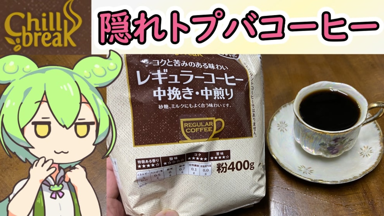 隠れトップバリュー(チルブレイク)の「レギュラーコーヒー・中挽き・中煎り」です。<br><br><br>【参考】<br>コクと苦みのある味わいレギュラーコーヒー中挽き・中煎り(約400g)(トップバリュ)<br><a href="https://www.topvalu.net/items/detail/4902121280209/" target="_blank" rel="noopener nofollow">https://www.topvalu.net/items/detail/4902121280209/</a><br>チルブレイク レギュラーコーヒー 中挽き・中煎り(約1kg)(トップバリュ)<br><a href="https://www.topvalu.net/items/detail/4549414322972/" target="_blank" rel="noopener nofollow">https://www.topvalu.net/items/detail/4549414322972/</a><br>アーモンドチョコレート(トップバリュ)<br><a href="https://www.topvalu.net/items/detail/4549741153096/" target="_blank" rel="noopener nofollow">https://www.topvalu.net/items/detail/4549741153096/</a><br><br><br>【使用した素材】(※敬称略)<br>(合成音声)VOICEVOX/ずんだもん/四国めたん<br><a href="https://voicevox.hiroshiba.jp/" target="_blank" rel="noopener nofollow">https://voicevox.hiroshiba.jp/</a><br>(立ち絵)坂本アヒル<br><a href="https://seiga.nicovideo.jp/seiga/im10788496" target="_blank" rel="noopener">im10788496</a>/<a href="https://seiga.nicovideo.jp/seiga/im10791276" target="_blank" rel="noopener">im10791276</a><br>(楽曲)甘茶の音楽工房/「楽しい麦畑」「お城の舞踏会」<br><a href="https://amachamusic.chagasi.com/" target="_blank" rel="noopener nofollow">https://amachamusic.chagasi.com/</a>