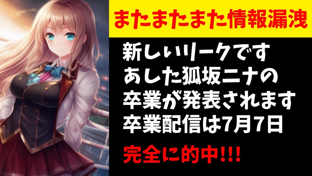 2023年6月26日午後11時55分(日本時間)ににじさんじEN所属の狐坂ニナさんの卒業が発表されたのですが、この運営による卒業発表とニナさんのによる卒業配信の発表が事前に海外ネット掲示板の4chanでリークされており、4chanは祭りだわっしょい状態となっています。<br><br>引用<br><a href="https://twitter.com/NIJISANJI_World/status/1673344112018493440" target="_blank" rel="noopener nofollow">https://twitter.com/NIJISANJI_World/status/1673344112018493440</a><br><a href="https://boards.4channel.org/vt/thread/52162728#p52162917" target="_blank" rel="noopener nofollow">https://boards.4channel.org/vt/thread/52162728#p52162917</a><br><br>Youtube <a href="https://www.youtube.com/@V_Virgin_Mary" target="_blank" rel="noopener nofollow">https://www.youtube.com/@V_Virgin_Mary</a><br>twitter <a href="https://twitter.com/V_Virgin_Mary" target="_blank" rel="noopener nofollow">https://twitter.com/V_Virgin_Mary</a><br><br>使用素材<br>高品質なフリー動画素材 - Pixabay <a href="https://pixabay.com/ja/videos" target="_blank" rel="noopener nofollow">https://pixabay.com/ja/videos</a>