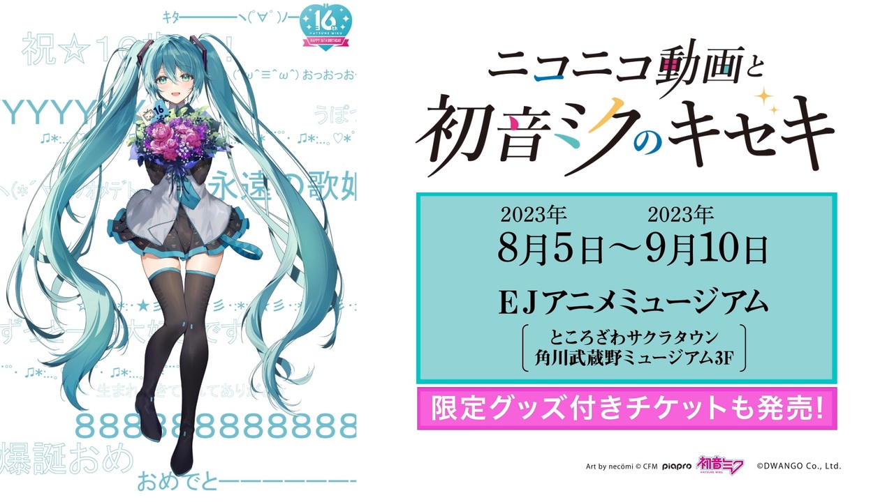 ★ ニコニコ動画における初音ミクをヒストリー、楽曲、映像体験で振り返る、大規模展覧会!<br><br>【ニコニコ動画と初音ミクのキセキ】<br>会期:2023年8月5日(土)~9月10日(日)<br>会場:ところざわサクラタウン 角川武蔵野ミュージアム3F<br>------------------------------<br>2023年8月31日に16周年を迎えるバーチャル・シンガー 初音ミク。<br>彼女がこれまで様々なクリエイターやユーザーと歩んできた軌跡と奇跡を、ニコニコ動画を通して振り返ります。<br>様々な楽曲とエピソードの展示、楽曲の世界観に入り込むような空間体験、スペシャルなフォトスポットも多数登場。<br>16歳のアニバーサリーを会場でお祝いしましょう!<br><br>◆会場公式Twitterアカウント<br><a href="https://twitter.com/EJ_AnimeMuseum" target="_blank" rel="noopener nofollow">https://twitter.com/EJ_AnimeMuseum</a><br><br>◆公式サイトURL<br><a href="https://tokorozawa-sakuratown.com/special/miku16th/" target="_blank" rel="noopener nofollow">https://tokorozawa-sakuratown.com/special/miku16th/</a><br><br>主催:ニコニコ動画と初音ミクのキセキ 実行委員会<br>特別協力:クリプトン・フューチャー・メディア株式会社、株式会社ドワンゴ<br><br>イベント問合わせ先<br>ところざわサクラタウンお問い合わせフォーム <a href="https://tokorozawa-sakuratown.com/contact/" target="_blank" rel="noopener nofollow">https://tokorozawa-sakuratown.com/contact/</a><br><br>#初音ミク<br>#初音ミクニコニコ展<br>#HatsuneMiku<br><br>Art by necömi © Crypton Future Media, INC. www.piapro.net<br>© DWANGO Co., Ltd.