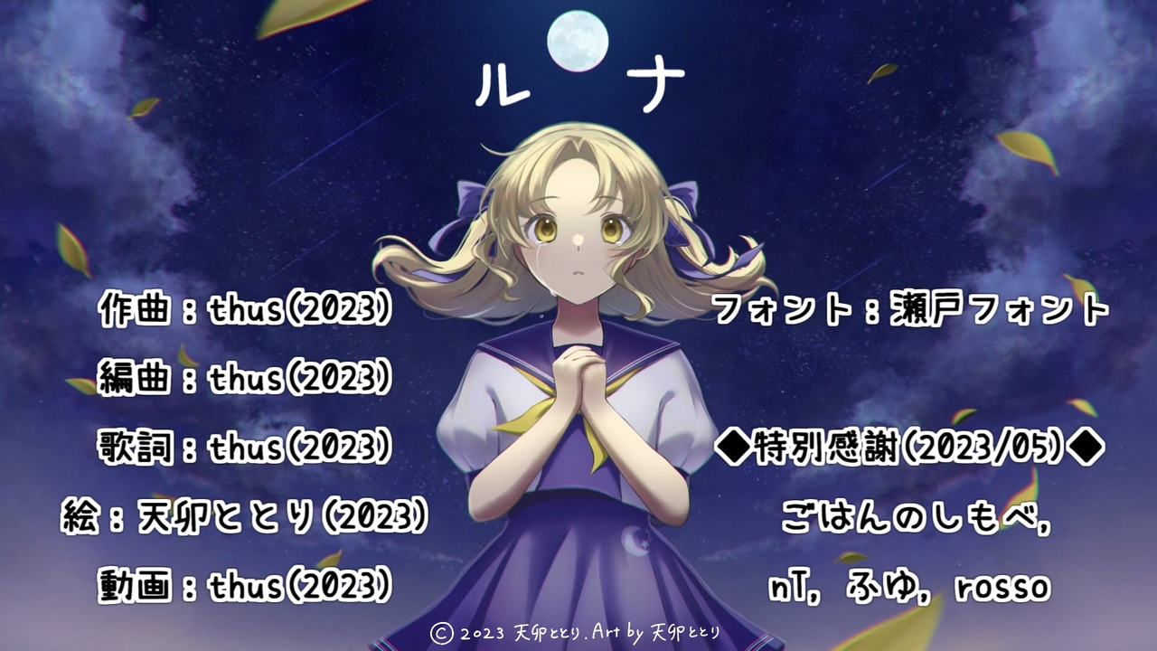 Art by 天卯ととり © 2023 天卯ととり<br>(Links:<a href="https://lit.link/nohakoniwa" target="_blank" rel="noopener nofollow">https://lit.link/nohakoniwa</a> )<br>―<br><br> どうも、月を見上げるthusです。カラオケ動画:<a href="https://www.nicovideo.jp/watch/sm42424662" class="watch">sm42424662</a><br> 書くことが無いわけではないのですが、憚られるところがあると言いますか、そんな感じです。かといって、それとは別に関係ないよく分からんことを書いても良いかと思いつつも、折角この曲なのにと思う所もないわけではなく、否然し個人的な話だしなぁと右往左往しております。私が一体何を書こうか書くまいかこう踏ん切りがつかないでいるのか、それを言って了えば簡潔なのですが、それを言うこと自体が色々孕むところがありますので、見送りましょう。<br> 代わりに現状でも書いておきます。原曲集アルバムの制作の目途が漸く立ちそうで、収録する新しい曲も丁度完成しました。後は、音源の最終確認と、配信情報の登録です。<br> お腹が空いてきました。お腹が空いてくると、月が美味しそうに見えますが、それはきっと月が竪穴式住居にそっくりだからでしょう。否待て、よく見ると竪穴式住居には全然そっくりじゃないし、抑々竪穴式住居は食べ物ではありませんね。嗚呼もうそんなことどうでも良いんだ、住居でも何でもいいから何か食べさせておくれ。<br> 最後に一番大事なことを。今回は天卯ととりさんに絵をお願いいたしました。改めましてお礼申し上げます。ありがとうございました。<br><br>2023/07/11 01:12:2,525再生<br>2023/07/29 21:03:1万再生<br /><br><br><br>====================<br>| 2026/01/04 21:00「インスペクタの自死未遂」:<a href="https://www.nicovideo.jp/watch/sm45800854" class="watch">sm45800854</a><br>| 投稿曲マイリスト:<a href="https://www.nicovideo.jp/mylist/57867175" target="_blank" rel="noopener">mylist/57867175</a><br>|――――――――――――――――――<br>| pixivFANBOX:<a href="https://thus.fanbox.cc/" target="_blank" rel="noopener nofollow">https://thus.fanbox.cc/</a><br>| アルバム等配信中:<a href="https://thus-library.blogspot.com/search/label/discography" target="_blank" rel="noopener nofollow">https://thus-library.blogspot.com/search/label/discography</a><br>| つなぐ(依頼・リクエスト):<a href="https://tsunagu.cloud/users/thus" target="_blank" rel="noopener nofollow">https://tsunagu.cloud/users/thus</a><br>|――――――――――――――――――<br>| YouTube:<a href="https://youtube.com/@thus" target="_blank" rel="noopener nofollow">https://youtube.com/@thus</a><br>| X:<a href="https://x.com/thus_submission" target="_blank" rel="noopener nofollow">https://x.com/thus_submission</a><br>| 他全リンク:<a href="https://lit.link/thus" target="_blank" rel="noopener nofollow">https://lit.link/thus</a><br>|――――――――――――――――――<br>| オフボーカル等:<a href="https://piapro.jp/thus_999discommunication" target="_blank" rel="noopener nofollow">https://piapro.jp/thus_999discommunication</a><br>| 楽曲/動画の二次利用に関して:<a href="https://bit.ly/3JRQQiZ" target="_blank" rel="noopener nofollow">https://bit.ly/3JRQQiZ</a><br><span style="color: #262626;">| </span><span style="color: #262626;"><strong>歌詞図書館(ふりがな有るよ!):</strong></span><a href="https://thus-library.blogspot.com/" target="_blank" rel="noopener nofollow">https://thus-library.blogspot.com/</a><br>====================
