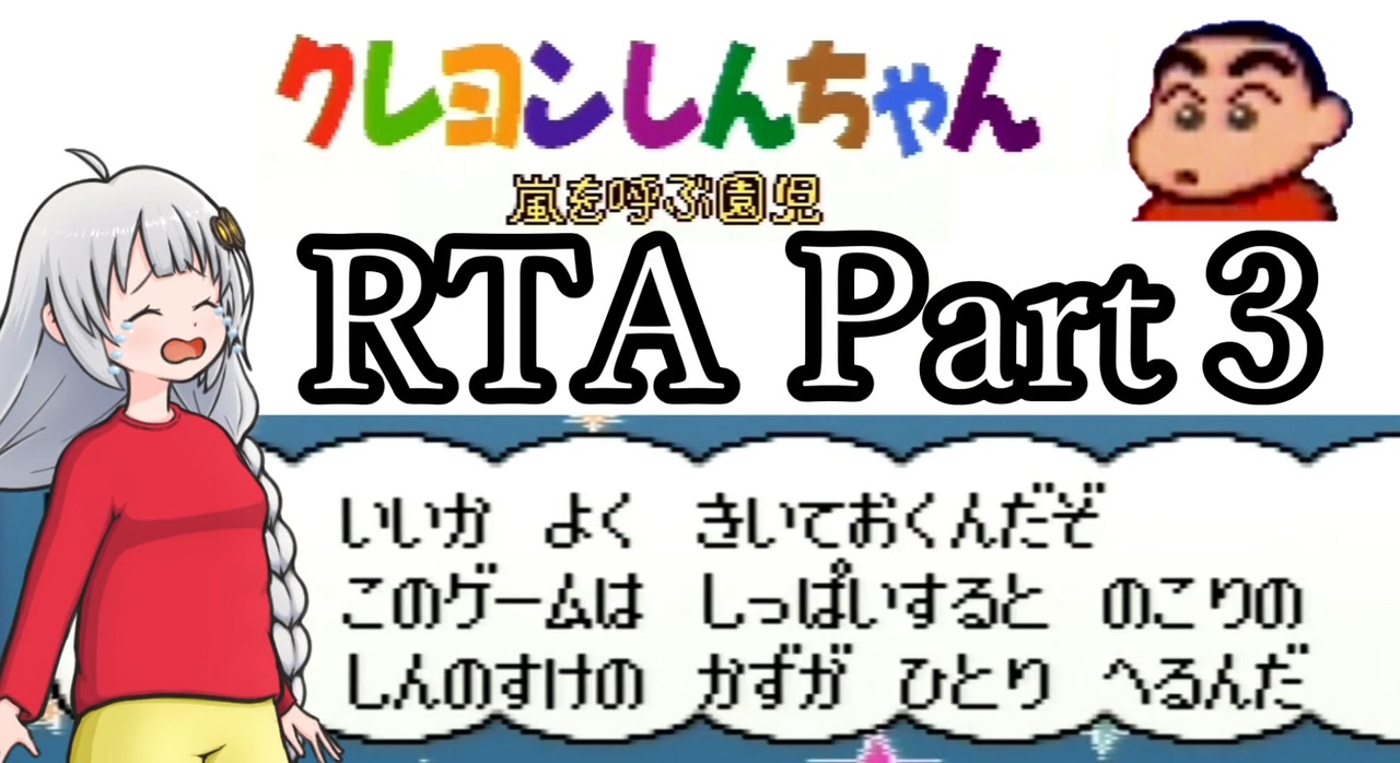 SFCゲームの「クレヨンしんちゃん 嵐を呼ぶ園児」RTAです。<br><br>Part3:秋エリアクリアまで<br><br>前→<a href="https://www.nicovideo.jp/watch/sm42428390" class="watch">sm42428390</a><br>次→<a href="https://www.nicovideo.jp/watch/sm42438043" class="watch">sm42438043</a><br><br><br>■計測区間<br>電源起動(リセットボタン押下)から、スタッフロールが表示されるまで<br><br>■動画作成にあたり<br>・あかりちゃんイラスト<br>mobushiさん:<a href="https://twitter.com/mobushi" target="_blank" rel="noopener nofollow">https://twitter.com/mobushi</a><br>・音声ソフト<br>VOICEROID2 紲星あかり<br><br>■全編ぶっ通し(無編集)<br><a href="https://youtu.be/VGtS8SkcfEE" target="_blank" rel="noopener nofollow">https://youtu.be/VGtS8SkcfEE</a><br><br>■Twitter<br>やまのひ:<a href="https://twitter.com/bergtag0811" target="_blank" rel="noopener nofollow">https://twitter.com/bergtag0811</a><br>